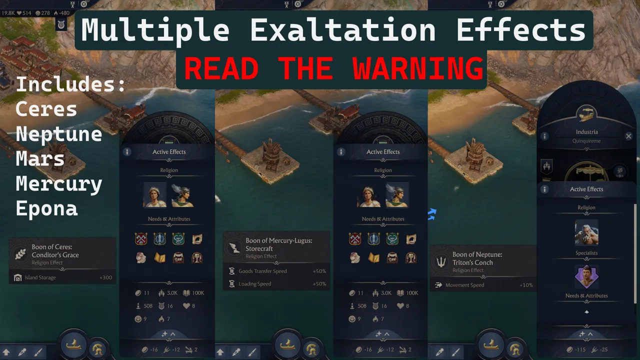 尊敬的行省总督们,《纪元117》中的“Multiple Exaltation Effects”模组为游戏策略层面带来了一场革新。它允许玩家通过定制化条件触发神明圣化的独特效果,而非依赖枯燥无味的传统奉献系统。