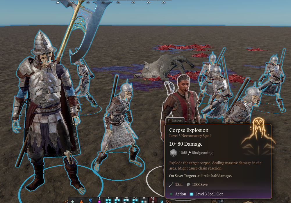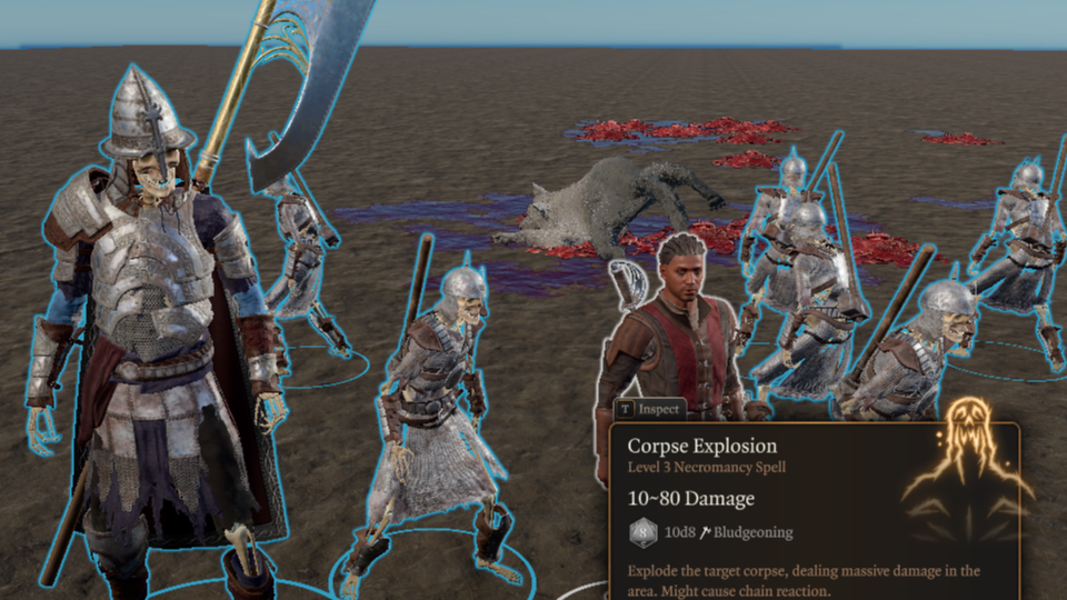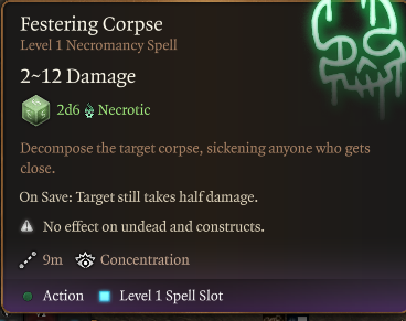 仍然喜欢囤积尸体?没问题。引入“尸体爆炸”!- 尸体爆炸:3级法师/牧师法术。引爆尸体,在小范围内造成10d8钝击伤害。你还可以以你的一名亡灵召唤物为目标,杀死它们的过程中。警告:这可能引发连锁反应。- 腐烂尸体:1级法师/牧师法术。使尸体腐烂,每回合对附近目标造成2d6点死灵伤害。需要集中精神。