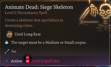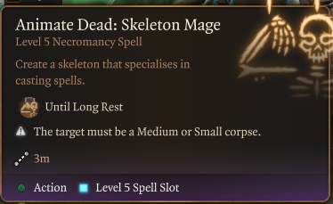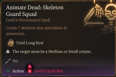 “召唤死者”现在可以通过6级升级召唤多达7个骷髅。召唤死者还可以召唤其他类型的骷髅:- 骷髅卫兵:默认骷髅的近战版本,这些骷髅伤害较低但更坚固。配备战锤(带武器动作)和盾牌。通过6级升级召唤最多7个。- 骷髅游侠:装备双弯刀和双手十字弓。在4级升级时解锁。通过6级升级召唤最多3个。