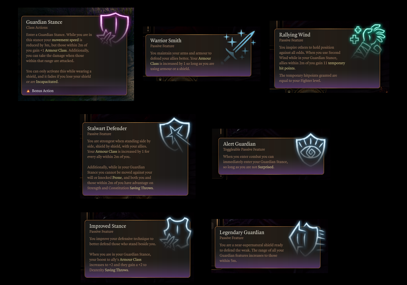 手持盾牌,守护者是专注于防御的团队型角色。守护者的主特性是他们的守护姿态,这是一种可以增强周围同伴防御力的形式。单独行动时,守护者可能威胁不大。但在团队中,守护者可以成为坚不可摧防线的核心。