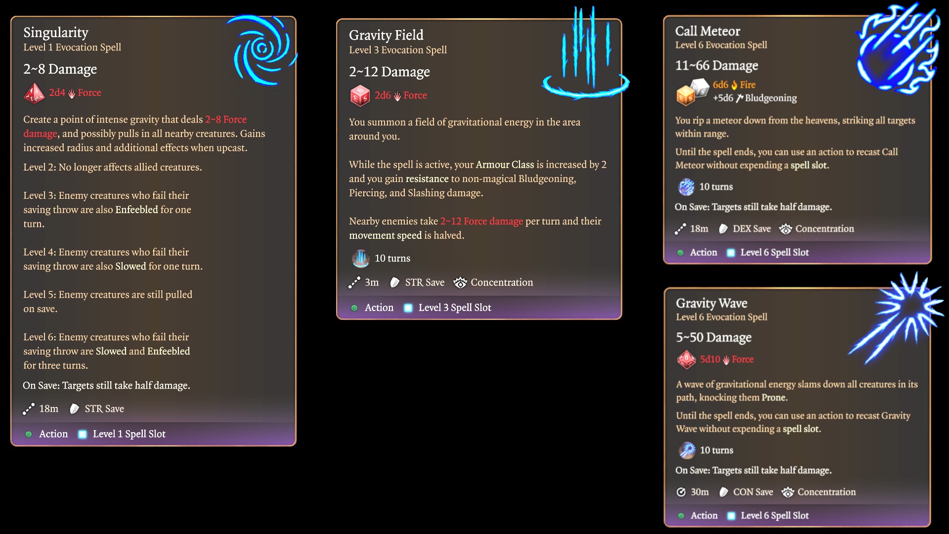 - 引力掌握: 你获得第3级法术 引力场,并且你的引力法术能力(解除武器、压制和跳跃)的力量增强。此外,你还获得了 轨道 作为引力法术能力。