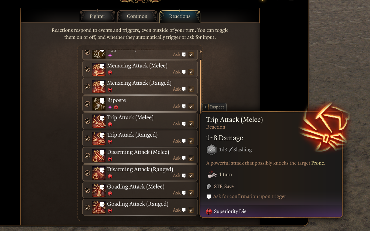 除了精准攻击外,其他所有战术都有近战/远程版本的区分。当从战斗大师子类特性或武术行家专长中选择战术时,反应版本也会解锁。