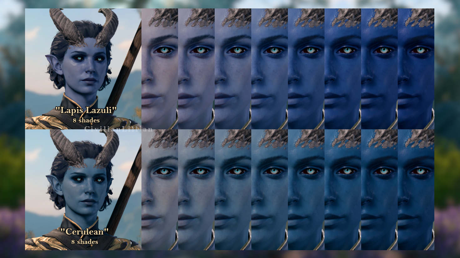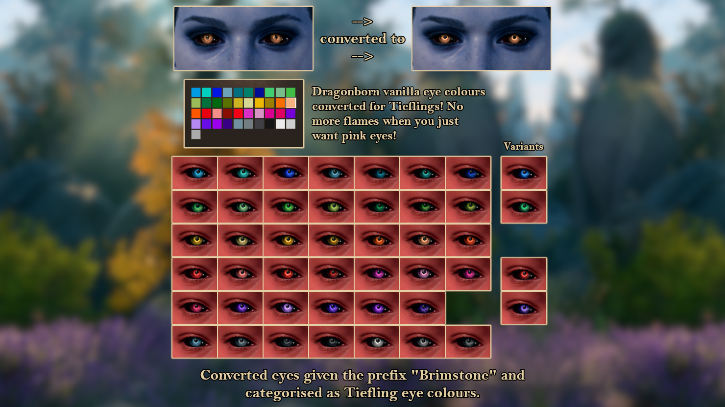 此模组为希望拥有龙裔眼睛颜色的多样性,但又不想带有火焰视觉效果的玩家提供了更多的自定义选择。此外还提供两种皮肤色调系列:“青色”和“蓝宝石”,以提供更多蓝色的选择。