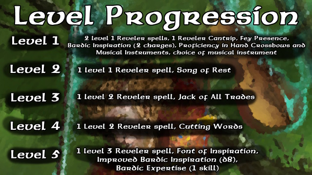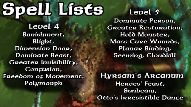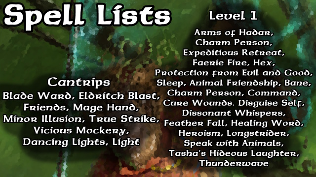 1级法术: 黑暗触须、魅惑人类、快速移动、精灵火、诅咒、防善除恶、睡眠、动物友谊、邪恶光环、魅惑人类、命令、治愈伤口。伪装术、不和谐低语、轻灵落体、治疗之言、英勇术、长足步、与动物交谈、塔莎的可怖笑声、震耳欲聋