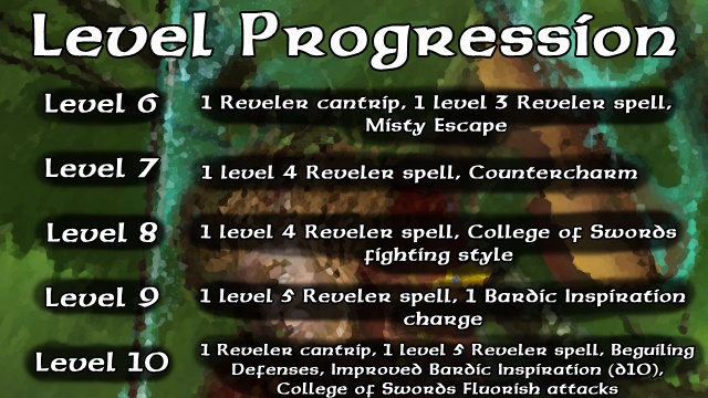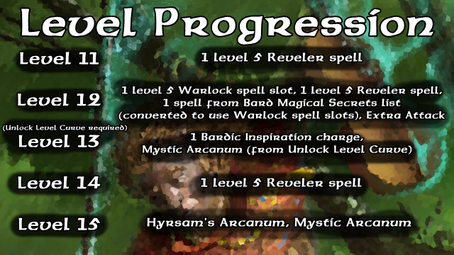 20 – 一个5级术士法术位,一个吟游灵感充能,一个来自欢宴者列表的5级法术,一个赫尔萨姆秘法列表中的法术,灵能大师(解锁等级曲线)