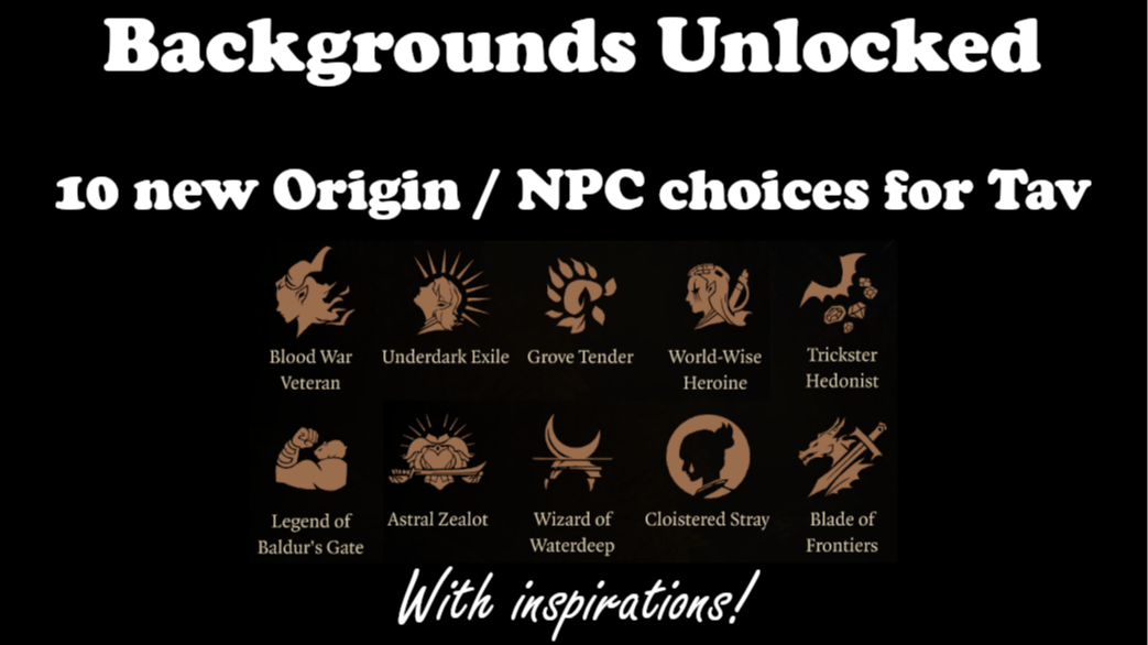4/20/25: 补丁8已准备就绪!解锁10个起源/NPC背景供TAV使用,这些背景基于10个原版背景进行编码。请参阅附带的图片以获取更多信息。