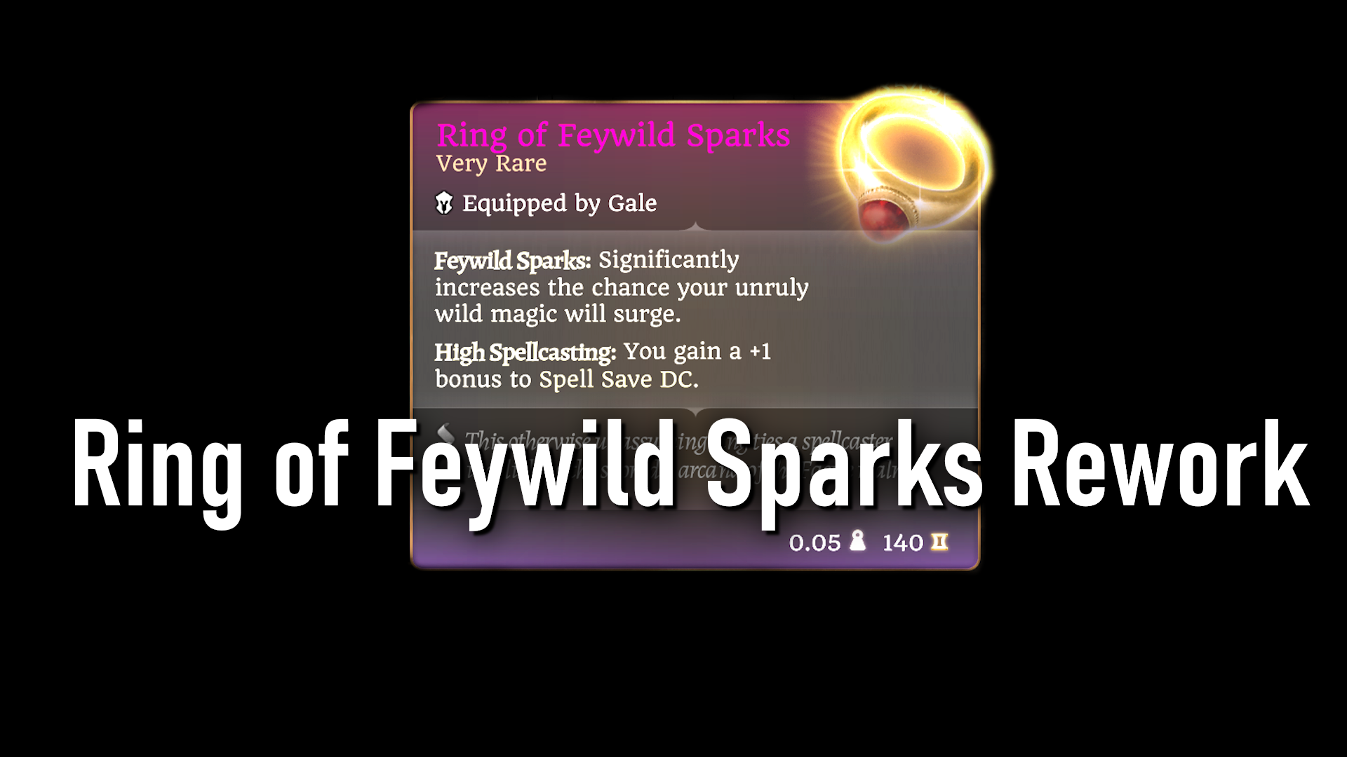 重新设计了费维尔火花之戒。移除了与混沌潮汐的互动,增加了佩戴该戒指时的基础野魔法爆发几率(从5%增加到20%),并修复了一个隐藏的法术豁免DC加成的错误。