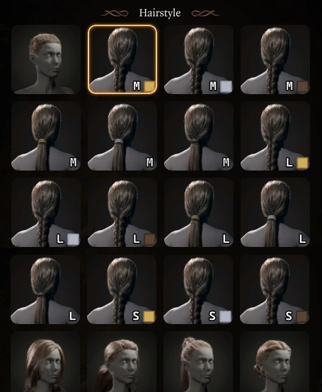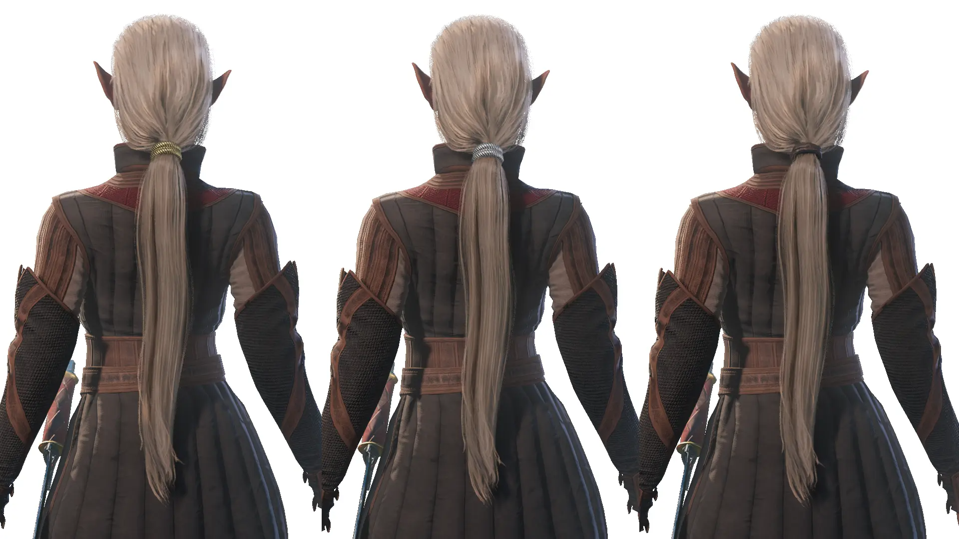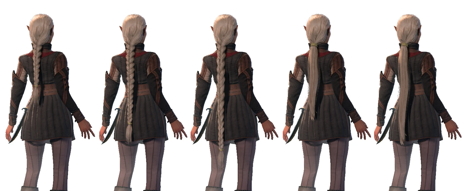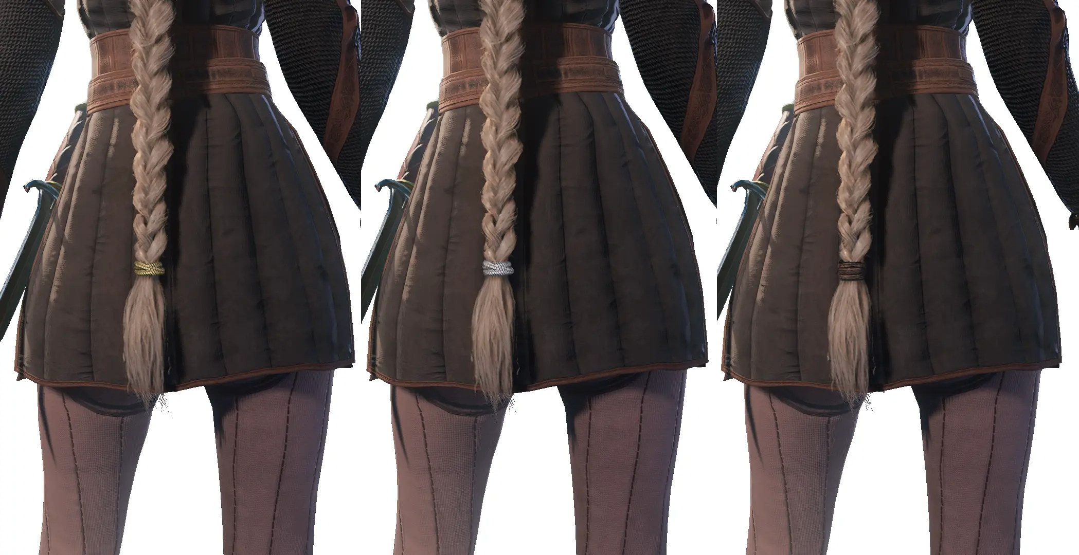 此模组添加了两种简单的发型,一种是束起的辫子,另一种是低马尾。这两种发型各有三种版本,分别配有金色、银色或皮革材质的绑带。辫子有三种长度选项,而马尾则有两种。