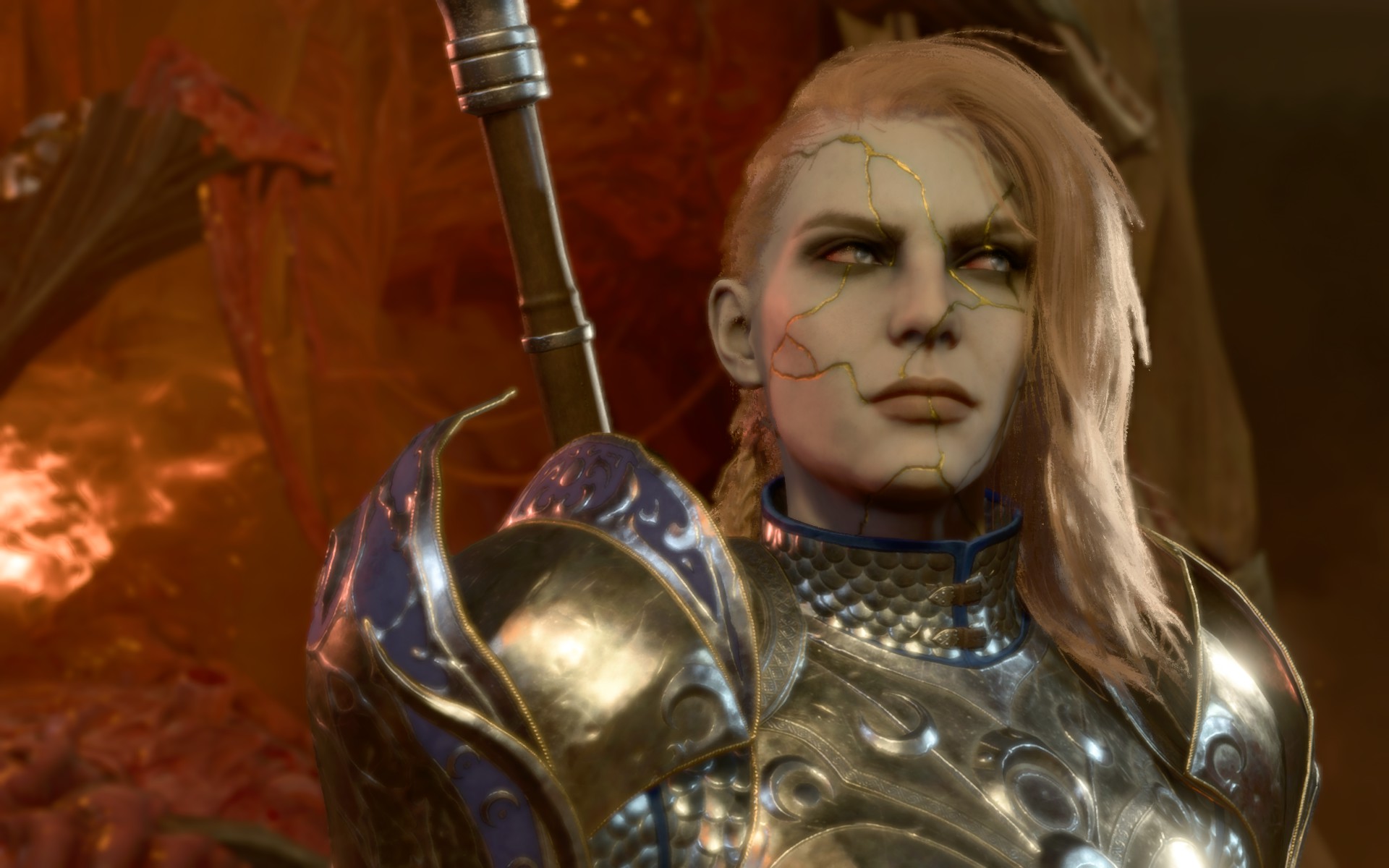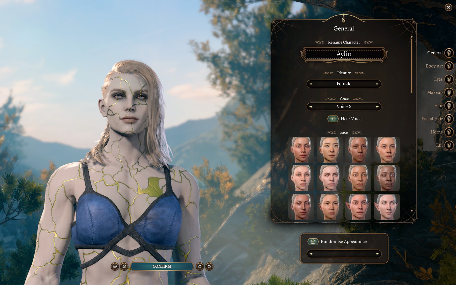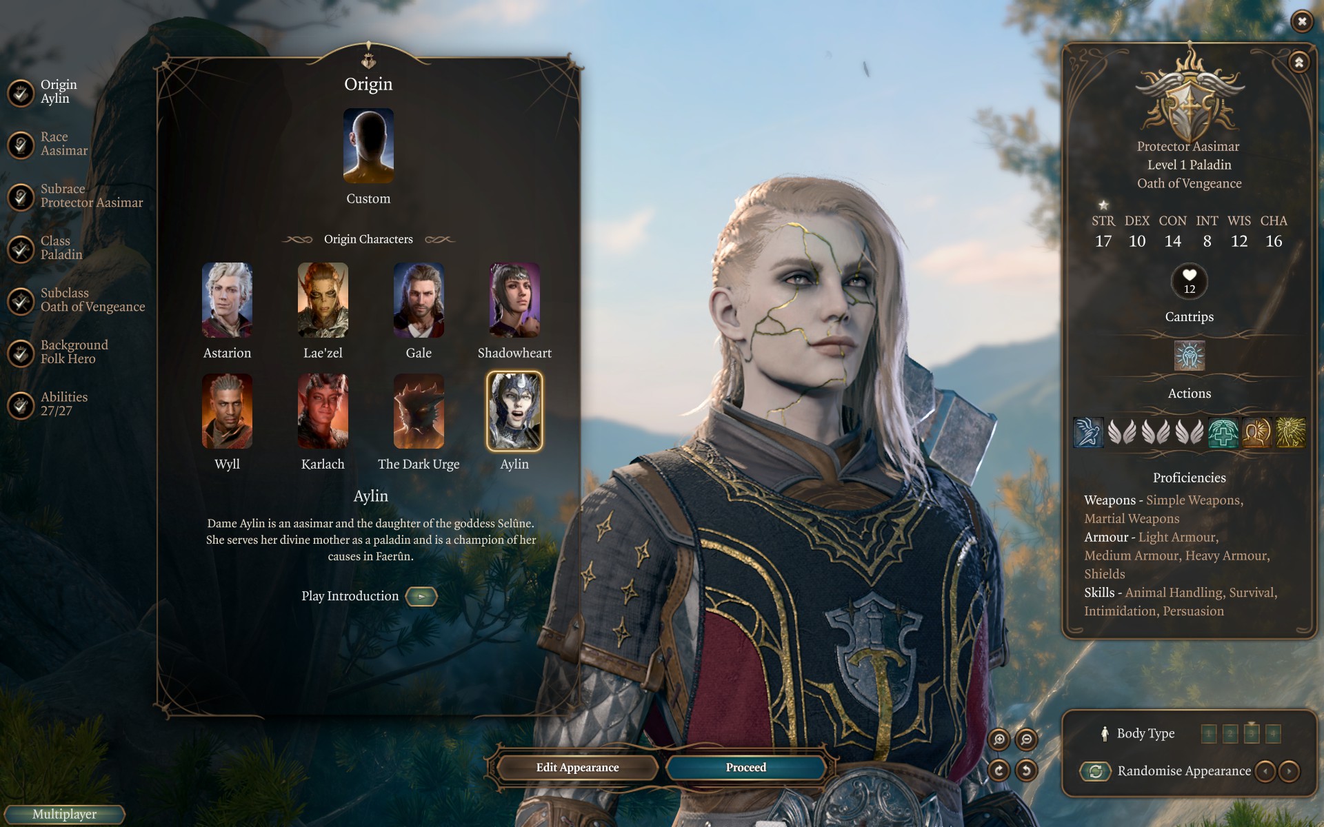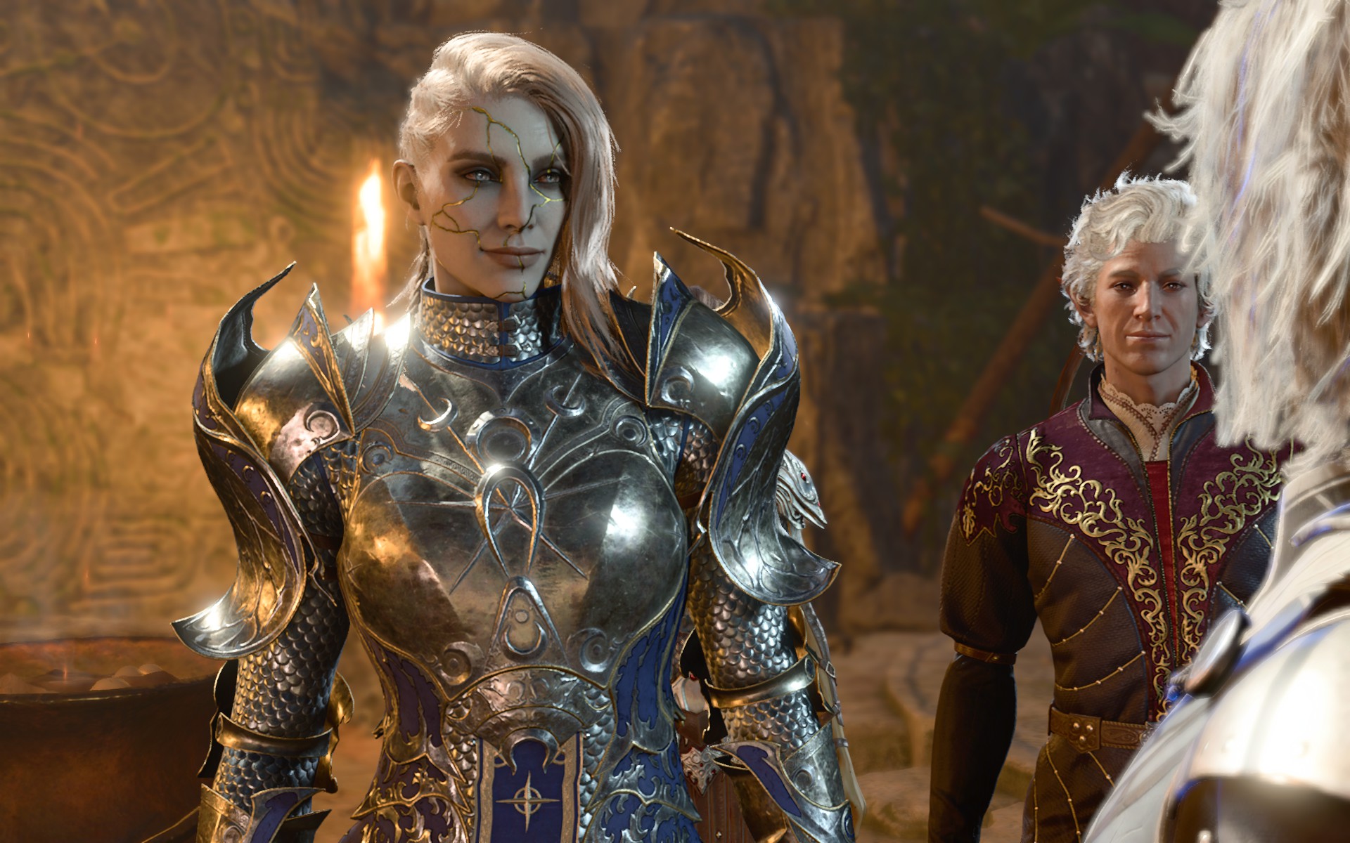 为了使用包含全身金缮纹理的完整自定义外观,艾琳现在可以作为起源角色进行选择。她的种族、职业和外貌都是可定制的(尽管体型不可更改,并且种族选择仅限于添加了自定义头部的角色),但她无论选择什么都会在对话中带有“阿西玛”和“塞勒恩圣骑士”的标签(请注意,“阿西玛”标签不会增加任何新内容,而是使用游戏中已有的标准“罕见种族”对话)。她没有其他特殊属性,并且机制上会具有你所选种族的统计数据和能力。此起源角色也与上述自定义阿西玛种族兼容。