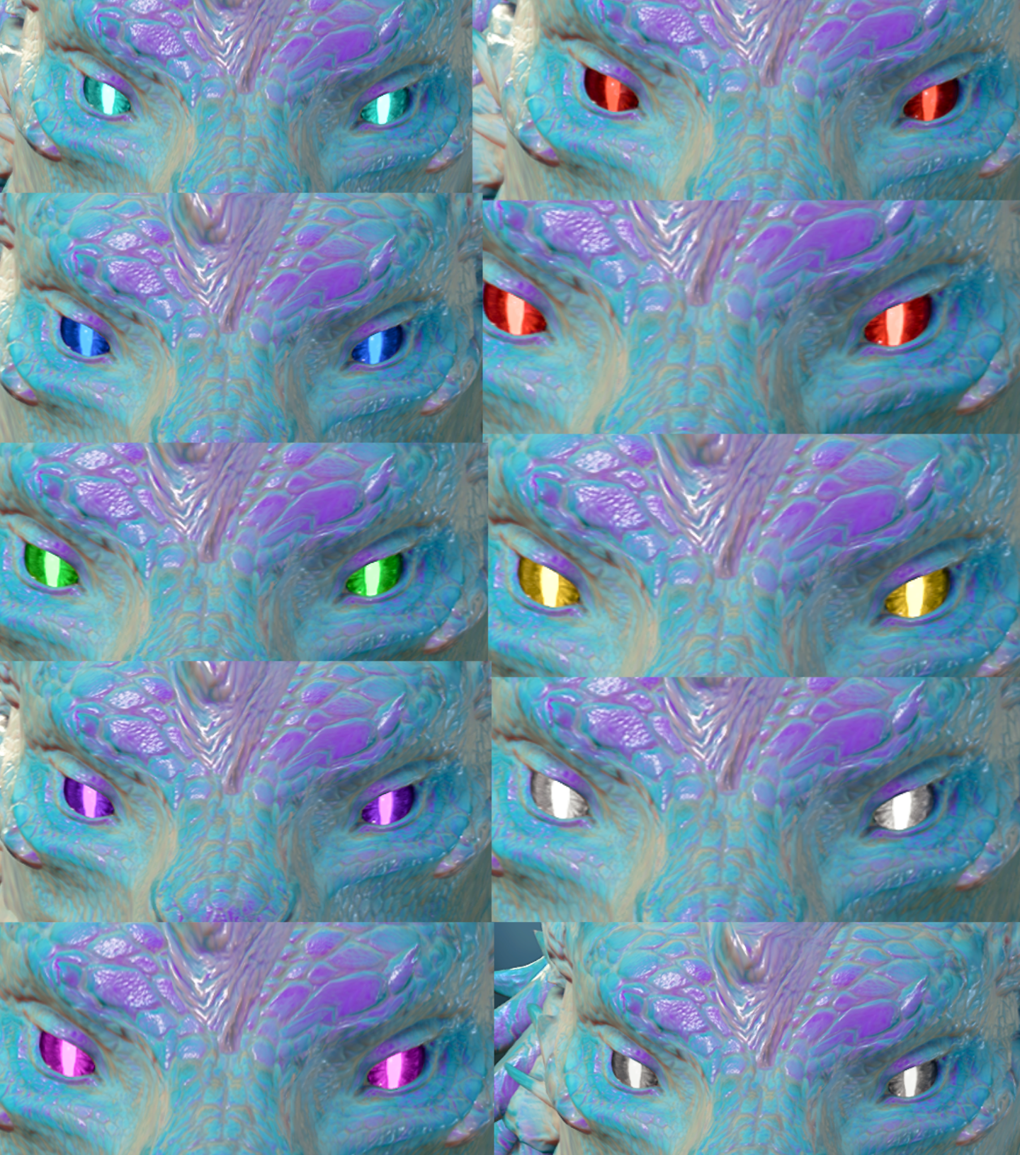 一组适用于《上古卷轴5:天际》中龙裔角色的独特发光眼和全彩色眼的配色方案。其中一种可以应用于其他种族,但另一种会使其他种族的眼睛虹膜变为红色。
