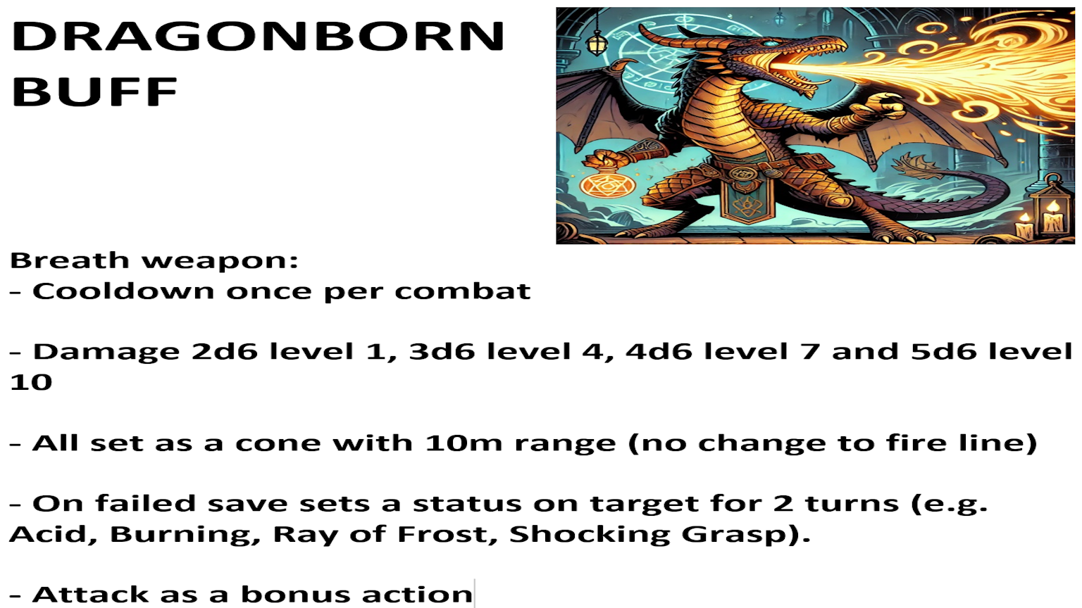 DRAGON BORN BUFF 呼吸武器:每场战斗冷却一次,伤害为2d6(1级),+1d6(4级)、+1d6(7级)和+1d6(10级)。所有设置为锥形范围,射程为10米。未通过豁免的敌人将在两回合内受到状态效果影响(例如酸性伤害)。