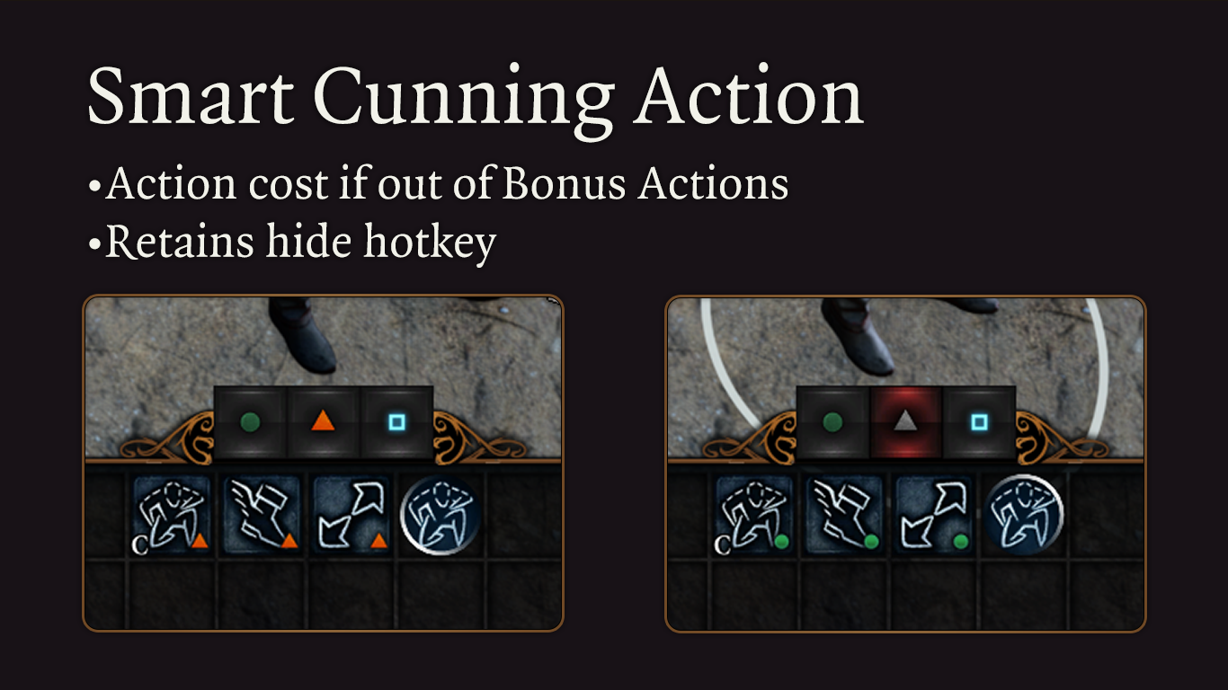 隐蔽、闪避和撤退默认情况下需要一个额外动作(Bonus Action),如果你没有额外动作,则需要一个行动(Action)。可以切换被动功能以恢复默认行为。隐蔽与游侠暗影追踪者和武僧阴影之道也得到了支持。