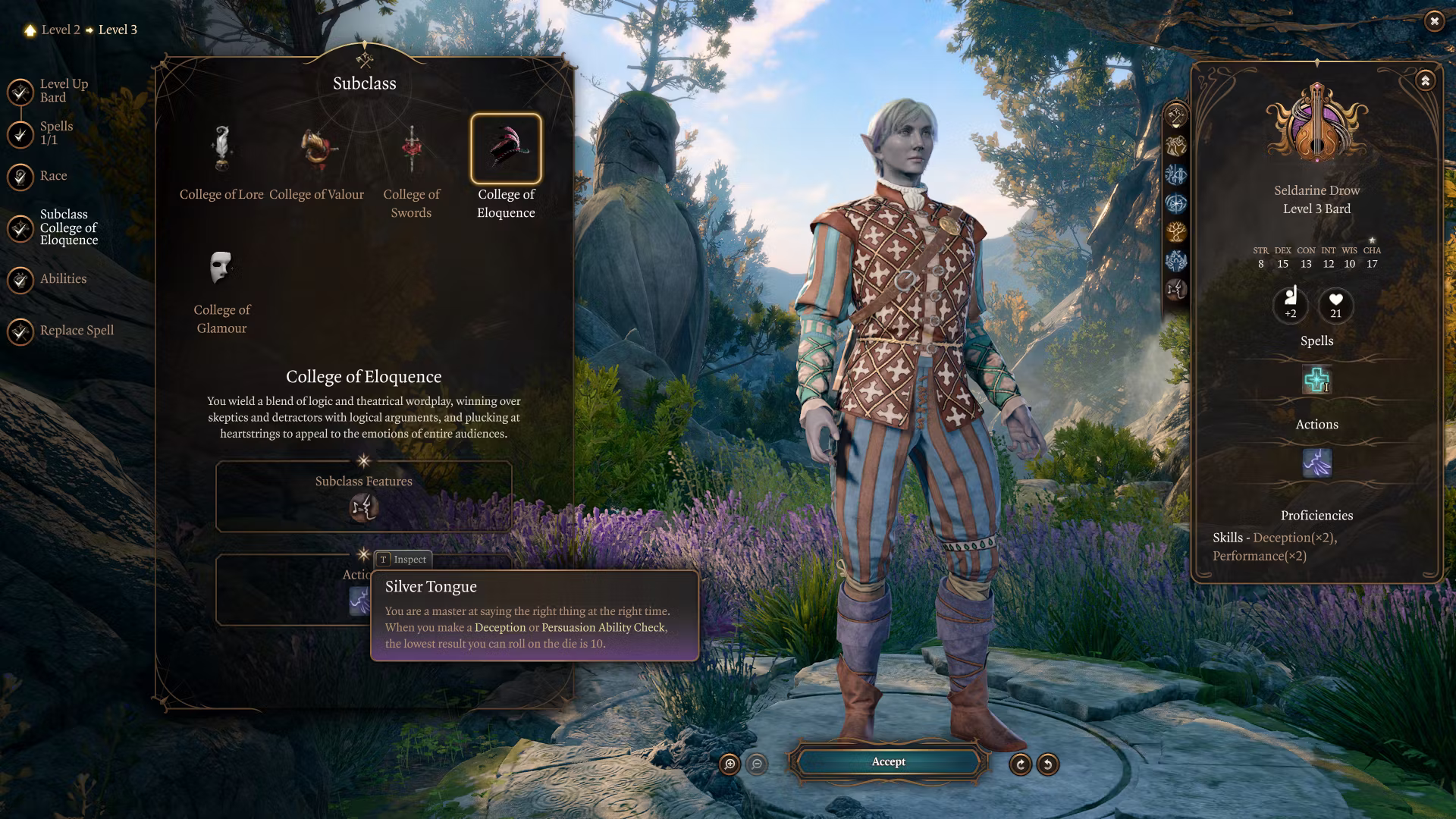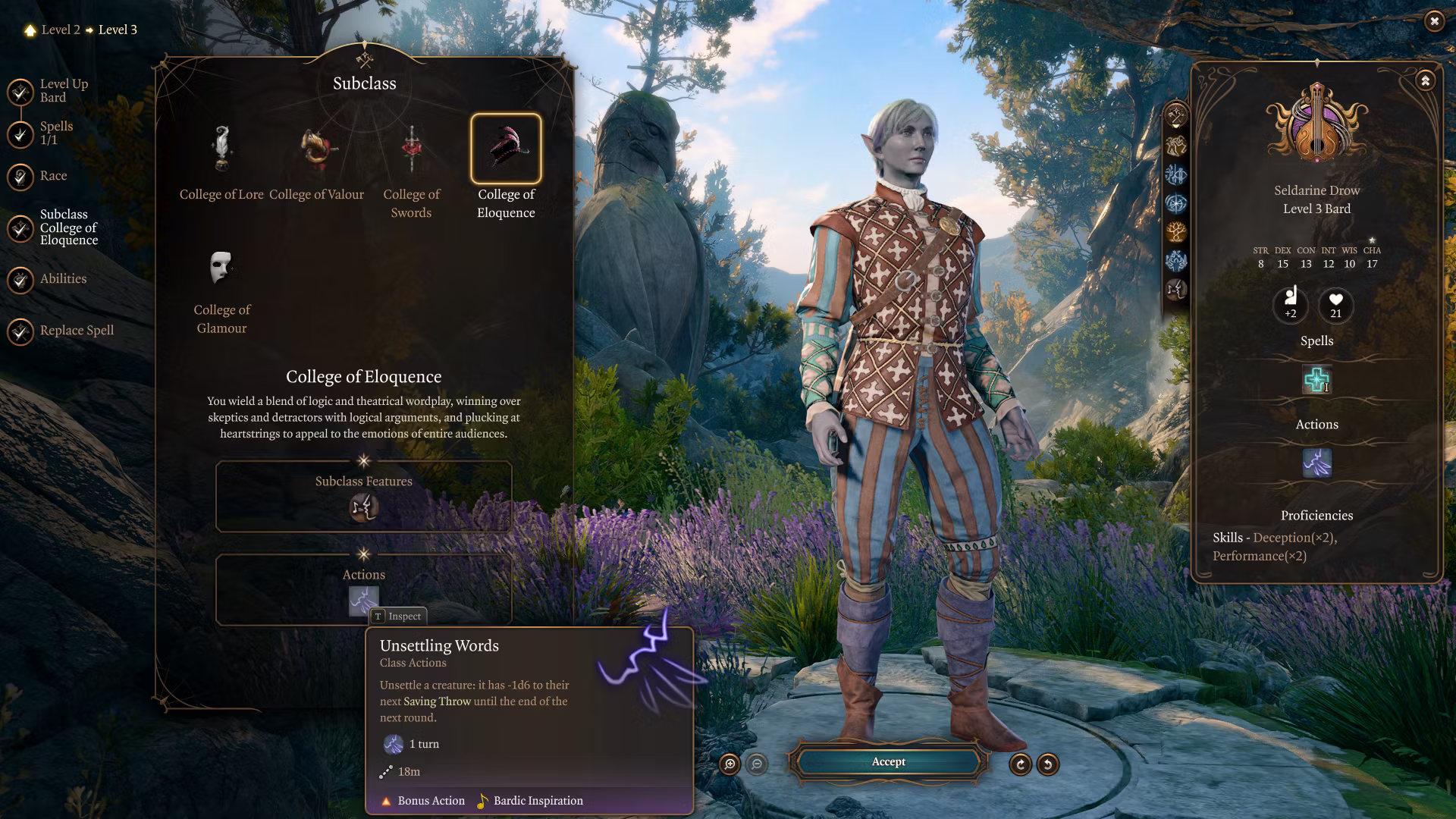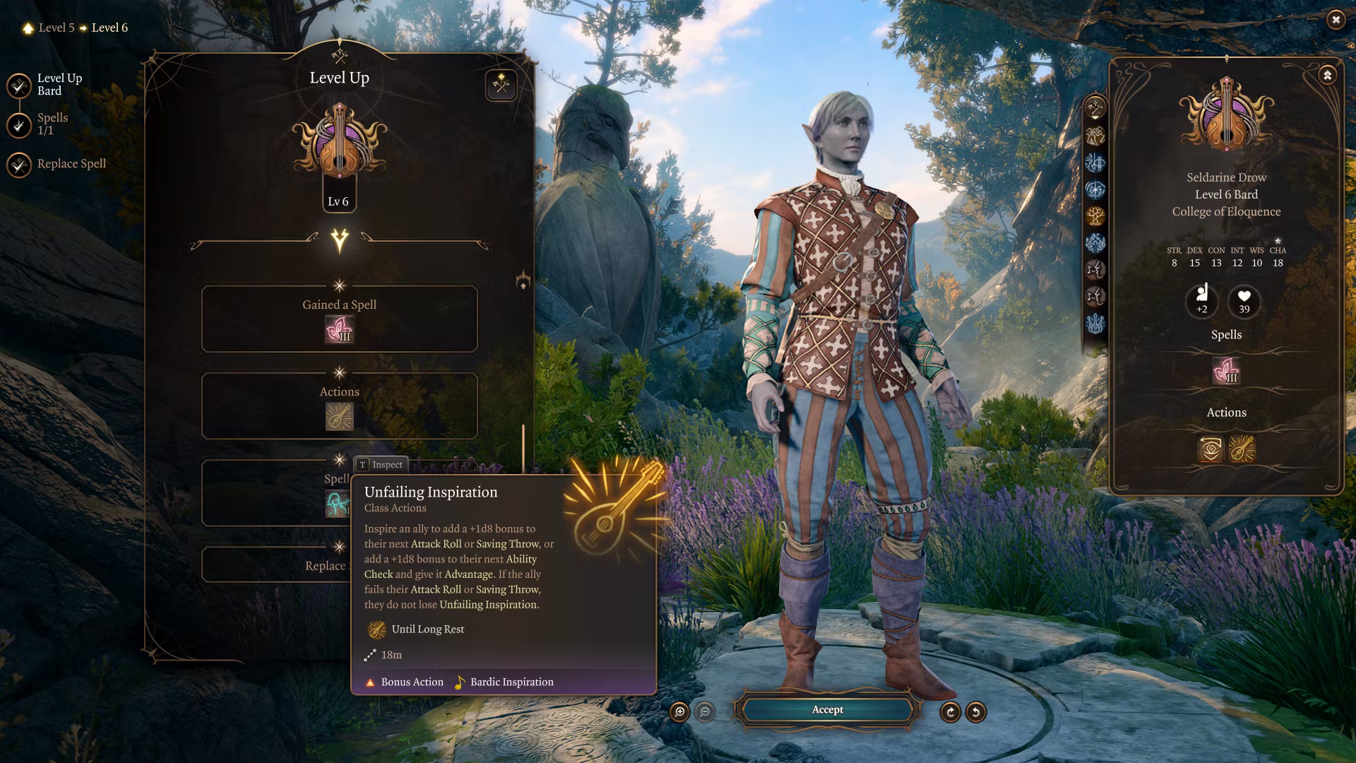 不屈的灵感:当盟友使用你的吟游诗人灵感来帮助进行属性检定时,他们可以获得优势;在攻击或豁免投骰中失败后不会失去吟游诗人灵感。与5E不同的是,如果你用于属性检定,则无法保留该次灵感。获得优势是尽可能接近原版的效果。