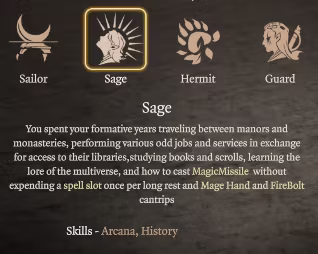 Sage(学者): 技能熟练:奥术和历史;法术:魔法手、火球、魔弹。