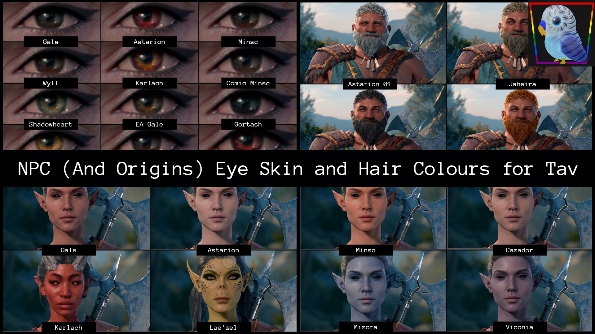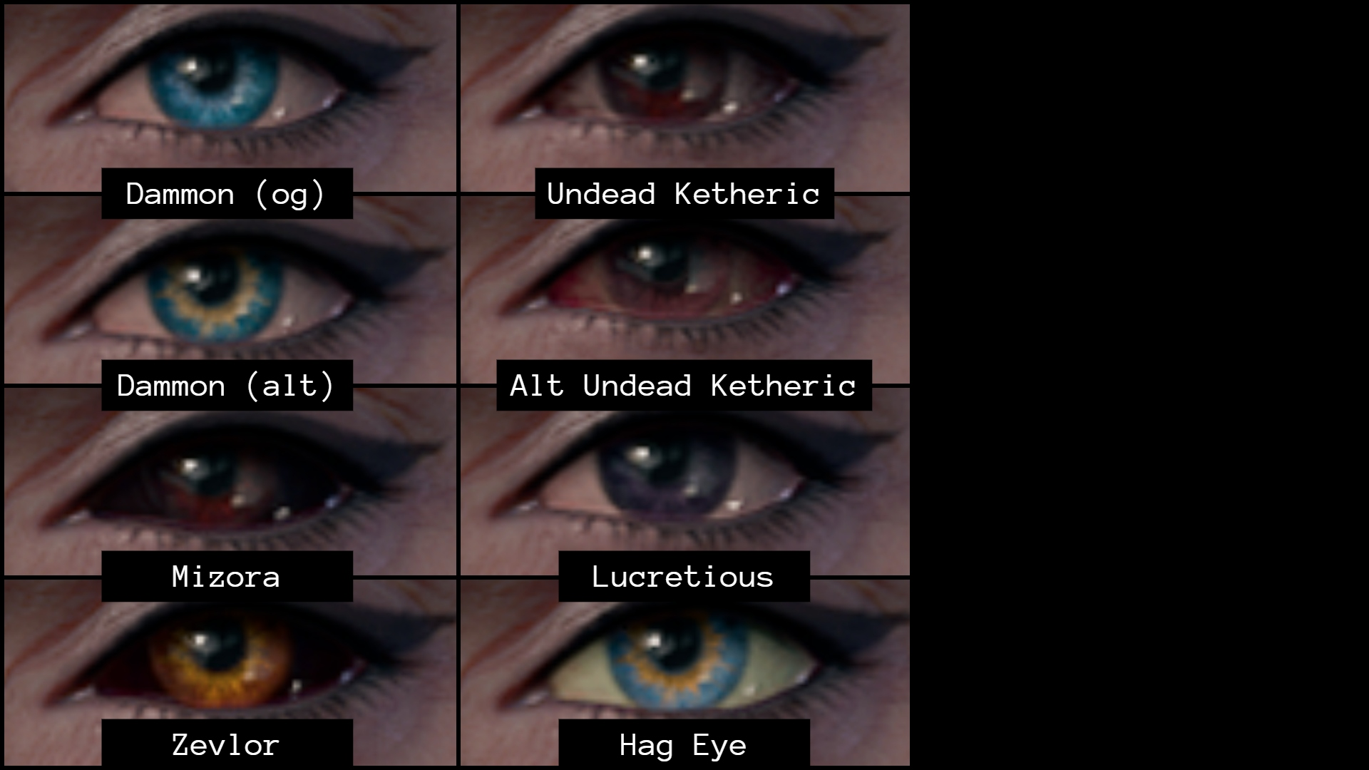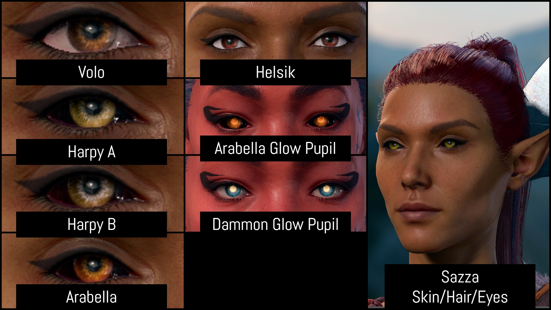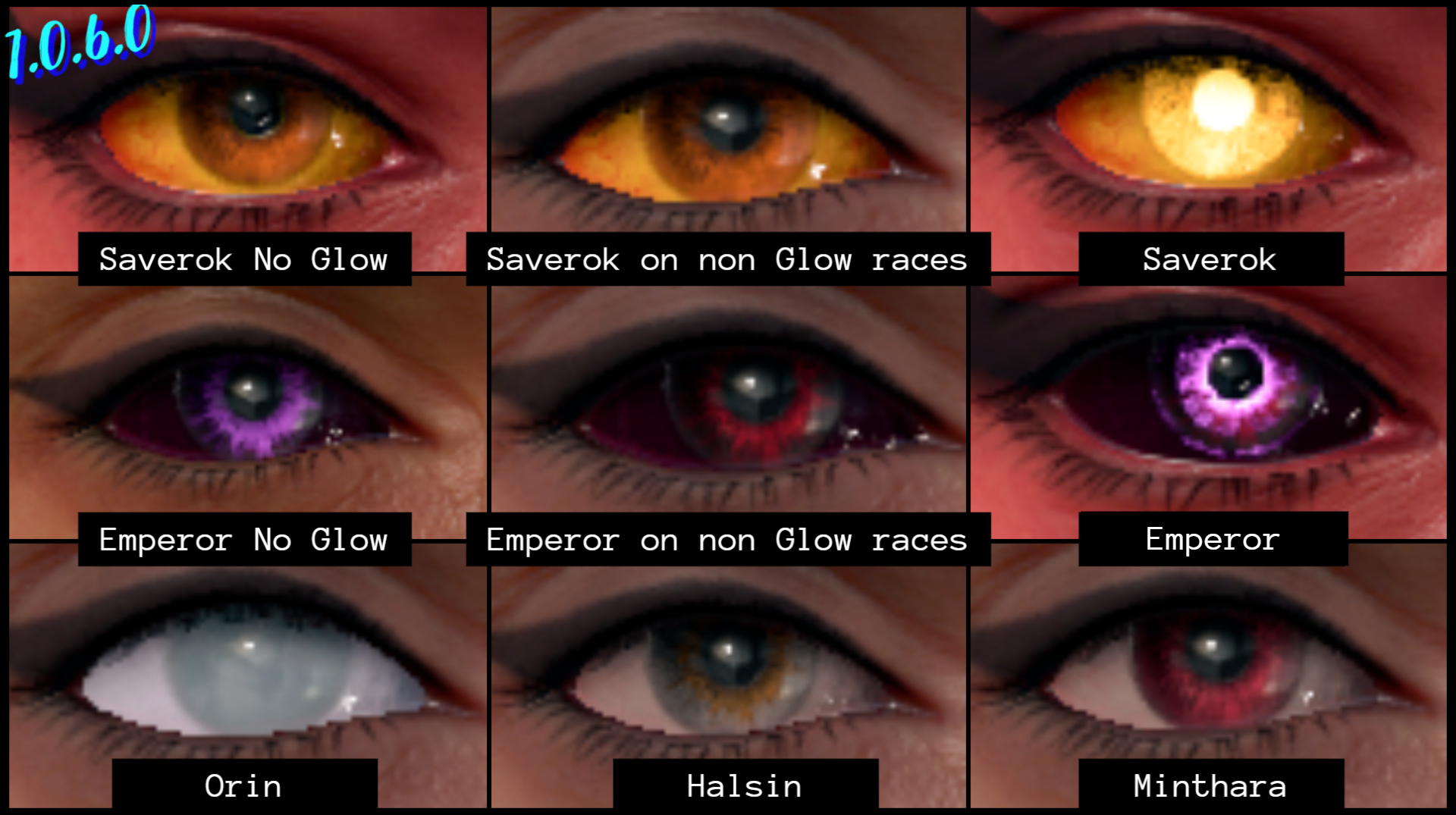 此模组提供了眼睛颜色选项,其中一些是为同伴角色设计的。原版的眼睛颜色完全未经修改,因此大多数情况下选择 Tiefling 时不会出现发光效果。它们也不支持 WotD Aasimar 的参数。