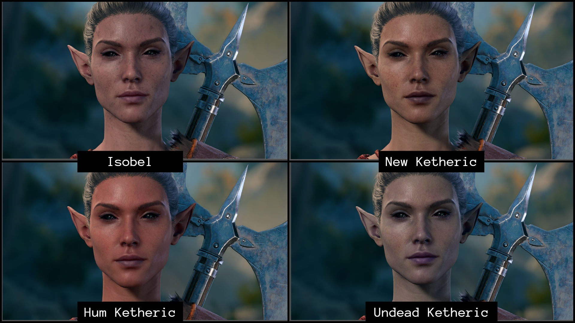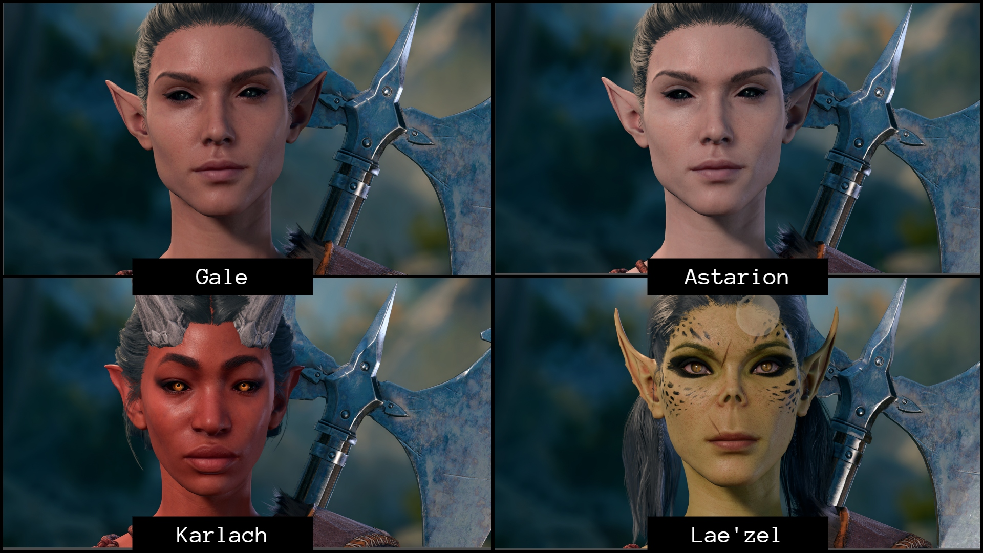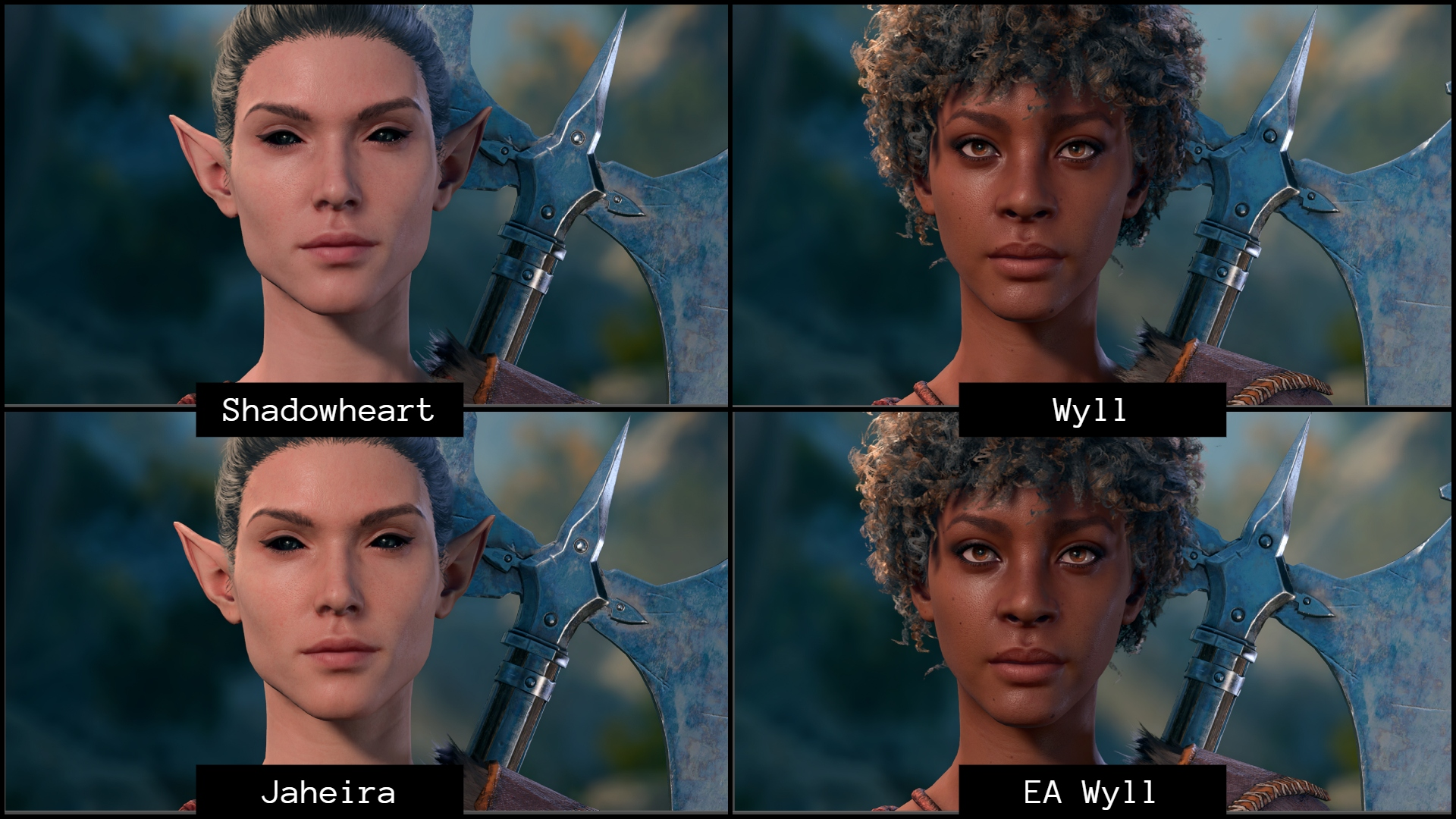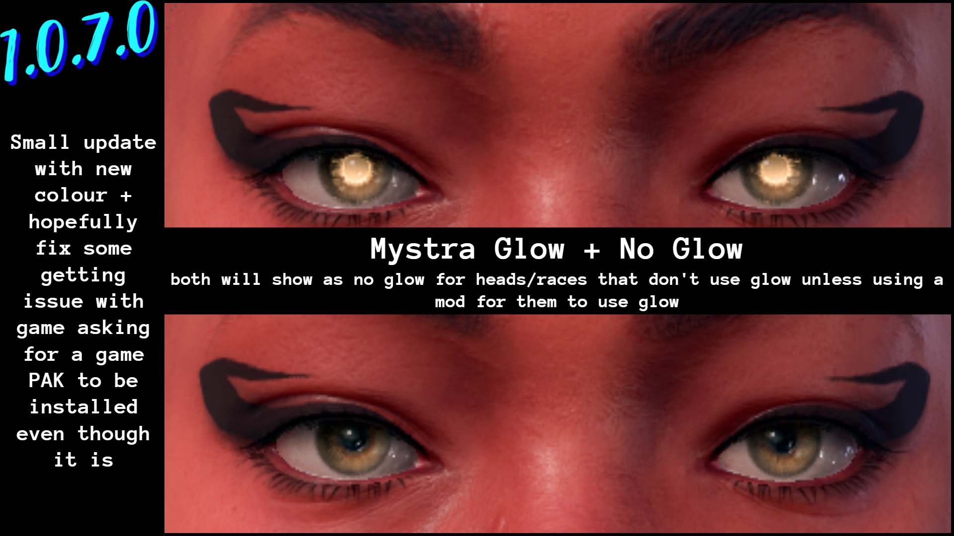 此模组提供了眼睛颜色选项,其中一些是为同伴角色设计的。原版的眼睛颜色完全未经修改,因此大多数情况下选择 Tiefling 时不会出现发光效果。它们也不支持 WotD Aasimar 的参数。
