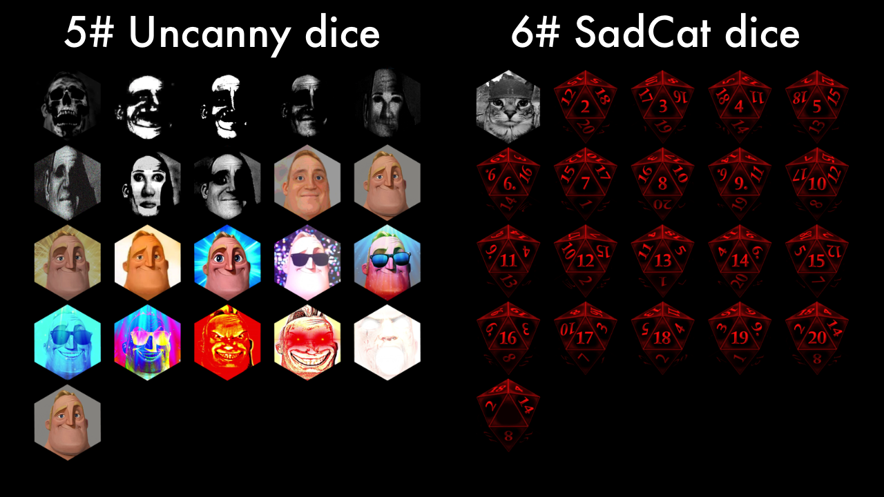 除了发生这些情况外,骰子看起来是正常的,如果你只是喜欢重制的颜色,可以选择没有梗的版本。这个模组包含6个自定义骰子:2个正常版和4个带有梗的版本。更多详情请参见图片,缩略图标记如下。祝你玩得开心!