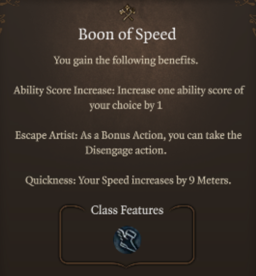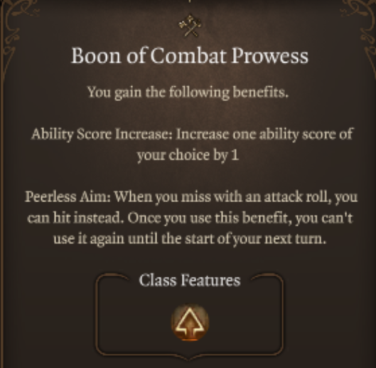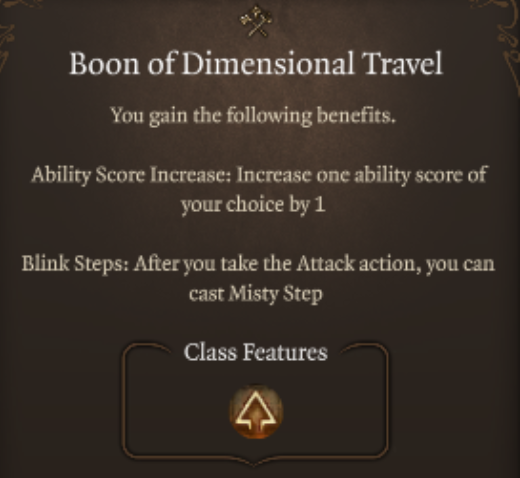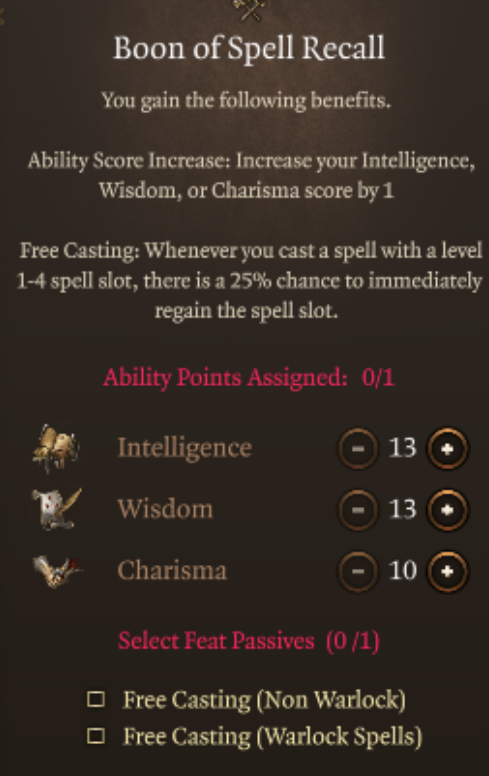 – 每当你使用1至4级的法术位施放一个法术时,有25%的概率立即恢复该法术位。在选择此功绩时,请根据所使用的法术位类型选择“术士”或“非术士”。你可以再次选择此功绩来选择另一种。