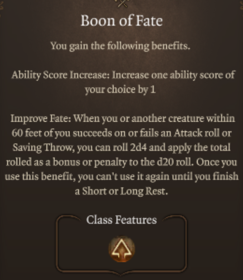 – 当你在范围内成功或失败一次攻击掷骰或豁免掷骰时,你可以投掷2d4并将其作为加值或减值应用到该次掷骰上。一旦使用此能力,则需短休后才能再次使用。