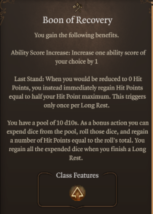 – 你有一个10个d10骰子的池子。作为附赠动作,你可以消耗这些骰子来恢复等同于总投掷结果的生命值。这些骰子在长休时刷新。