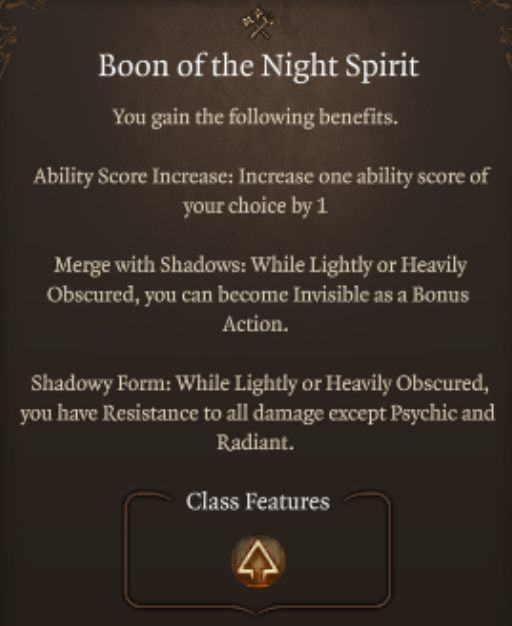 – 当你在轻度或重度遮蔽下,你可以使用附赠动作变为隐形。这种隐身状态不会因离开遮蔽区域而结束。