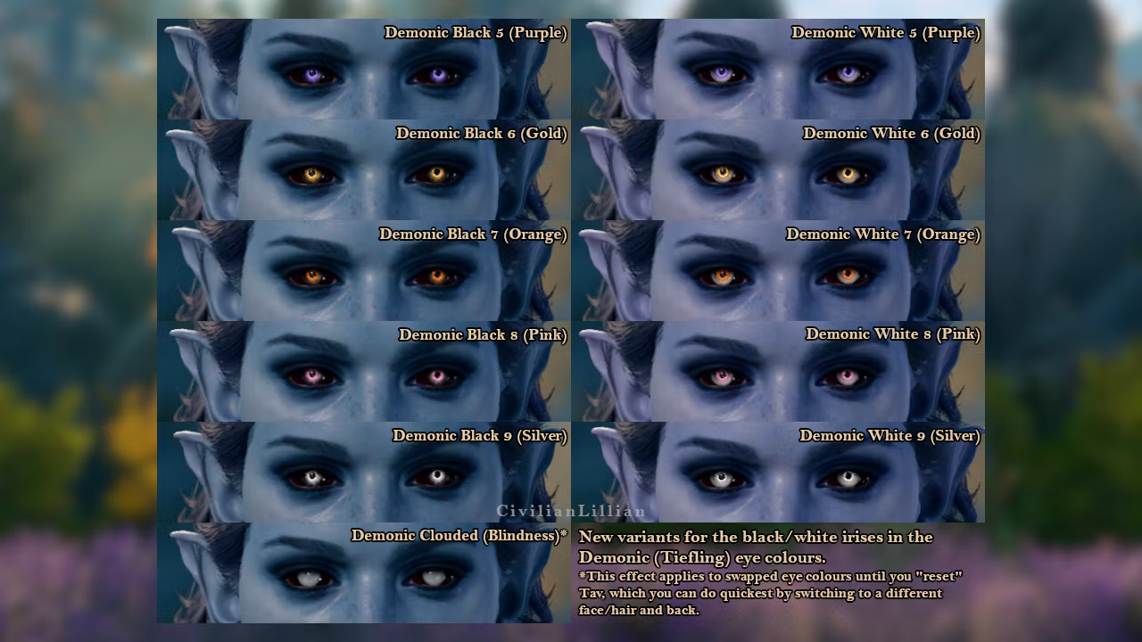 此模组为希望拥有龙裔眼睛颜色的多样性,但又不想带有火焰视觉效果的玩家提供了更多的自定义选择。此外还提供两种皮肤色调系列:“青色”和“蓝宝石”,以提供更多蓝色的选择。
