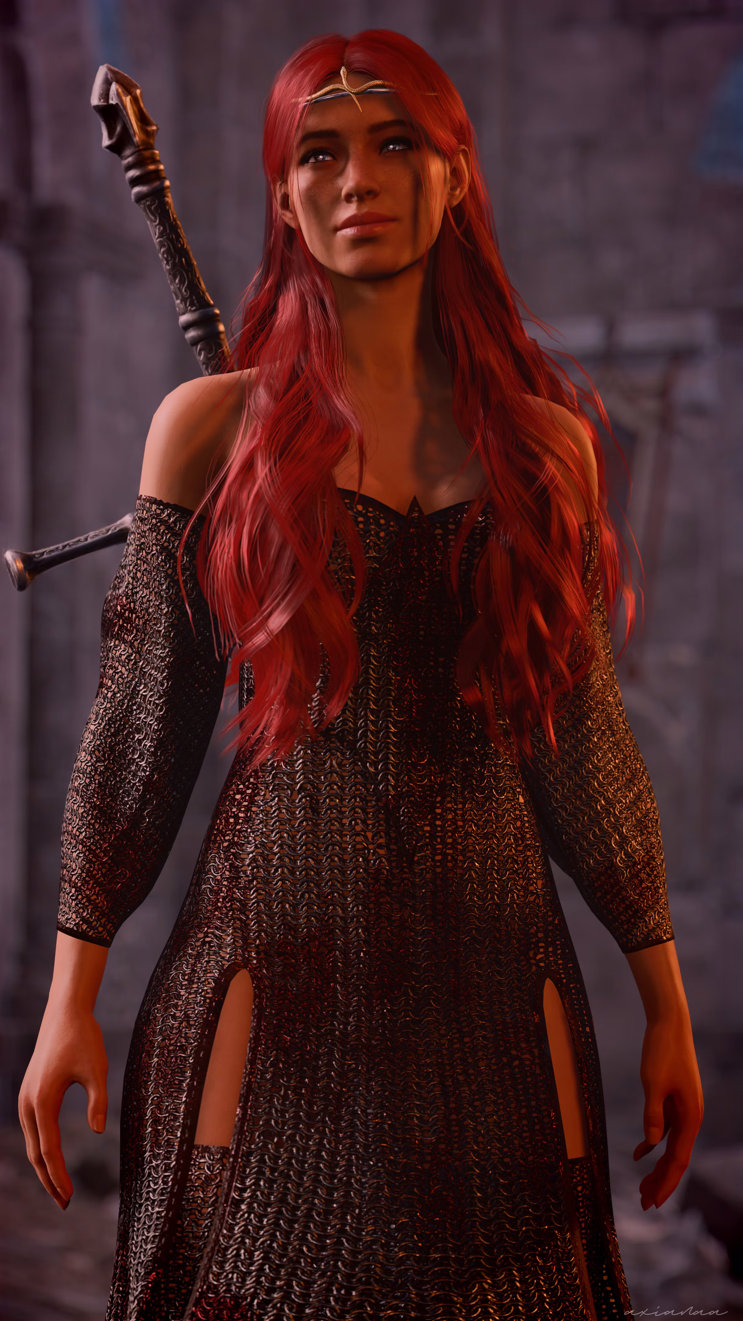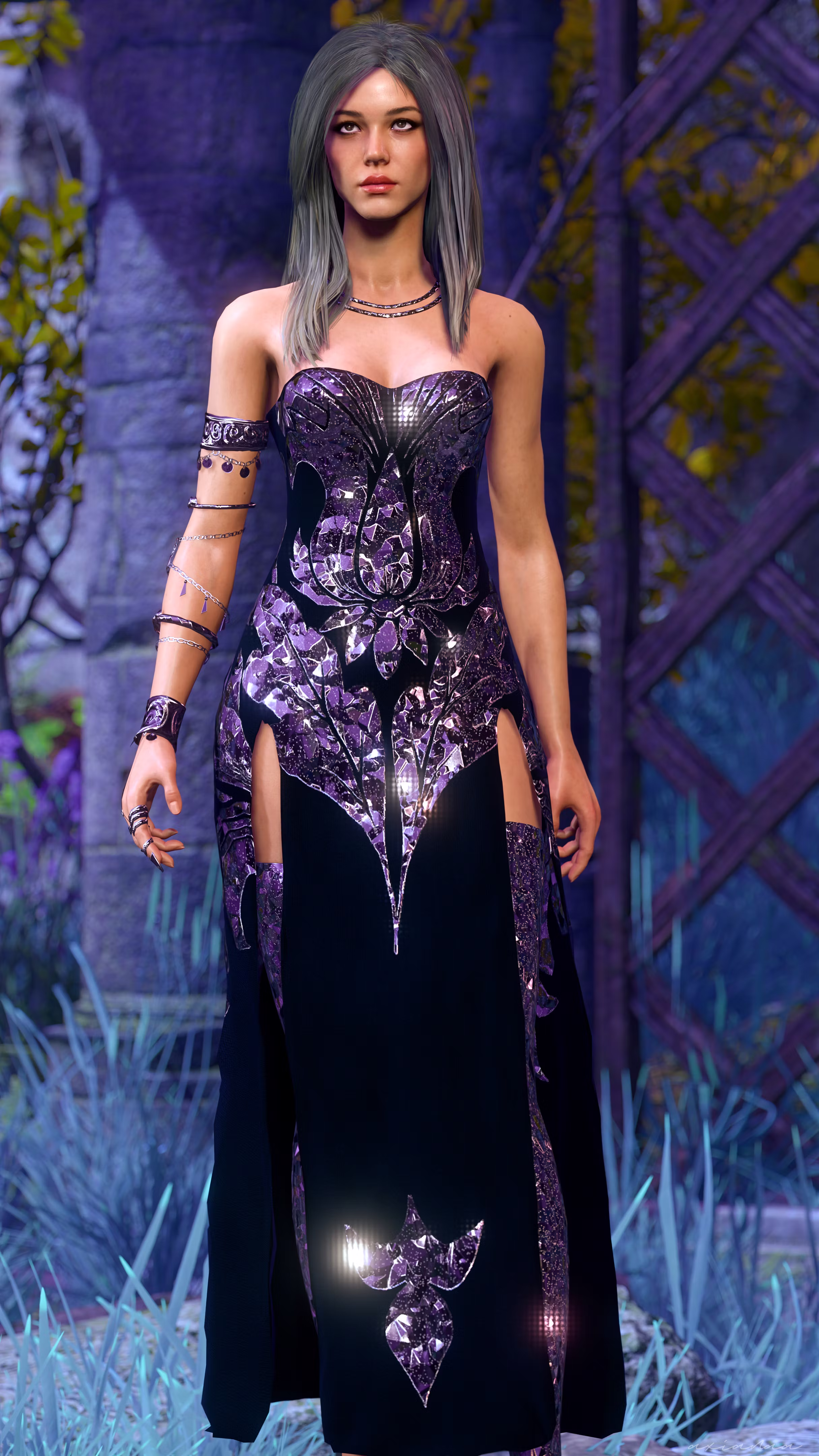 最初只是一个简单的裙子,最终变成了一个包含裙子、袖子、项链、紧身胸衣和腿部/脚部包裹物的完全模块化盔甲套装(BT1),每个部分都有四种材质变体(除了项链只有两种)。几乎所有物品都可以染色。
