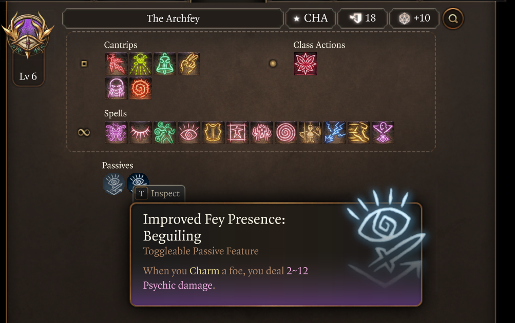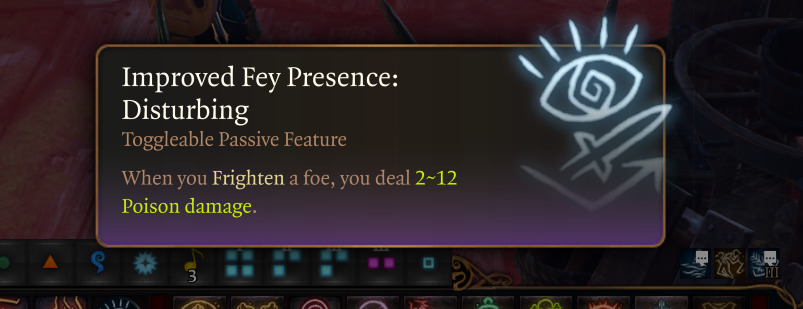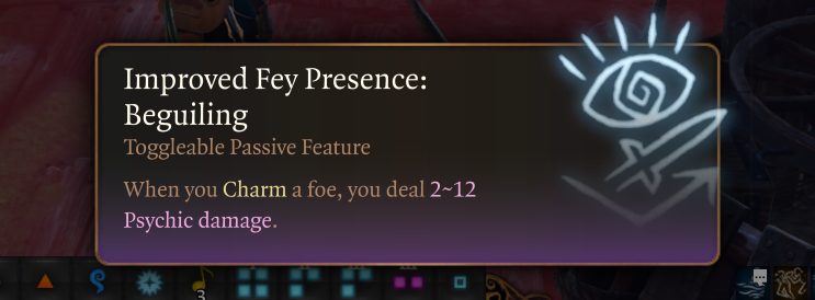 原因是因为被动技能影响了会导致恐惧和魅惑状态的群体。例如,催眠图案法术现在可以造成伤害,但魅惑效果会立即结束。此开关允许用户决定是否希望催眠图案造成心灵区域伤害或执行常规的催眠魅惑效果。心灵伤害会终止魅惑/催眠效果,然而这种被动技能造成的心理伤害不会终止来自脑魔力量或魅惑人类的效果。这似乎也不会与魅力吟游诗人的新魅惑功能互动。