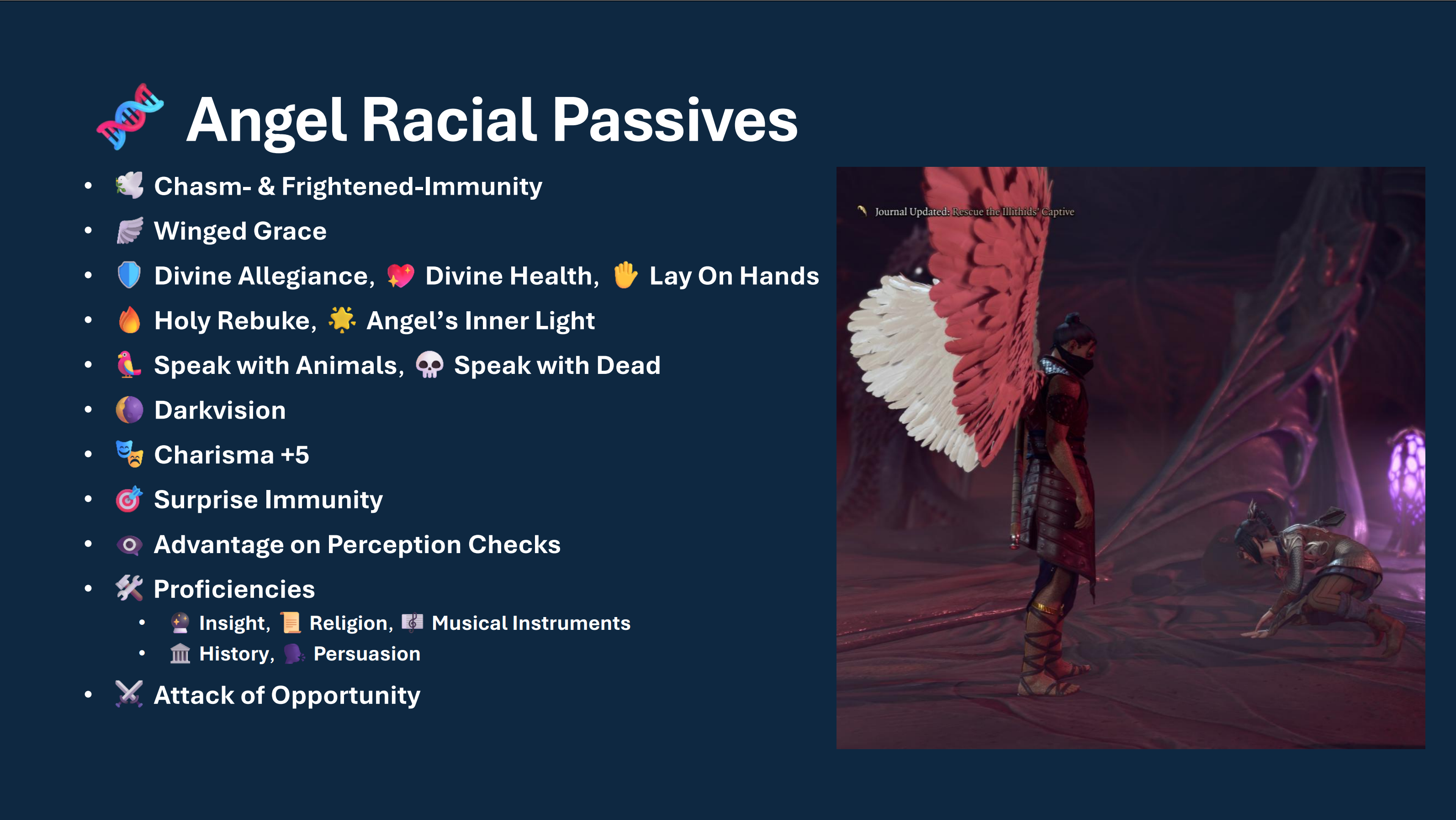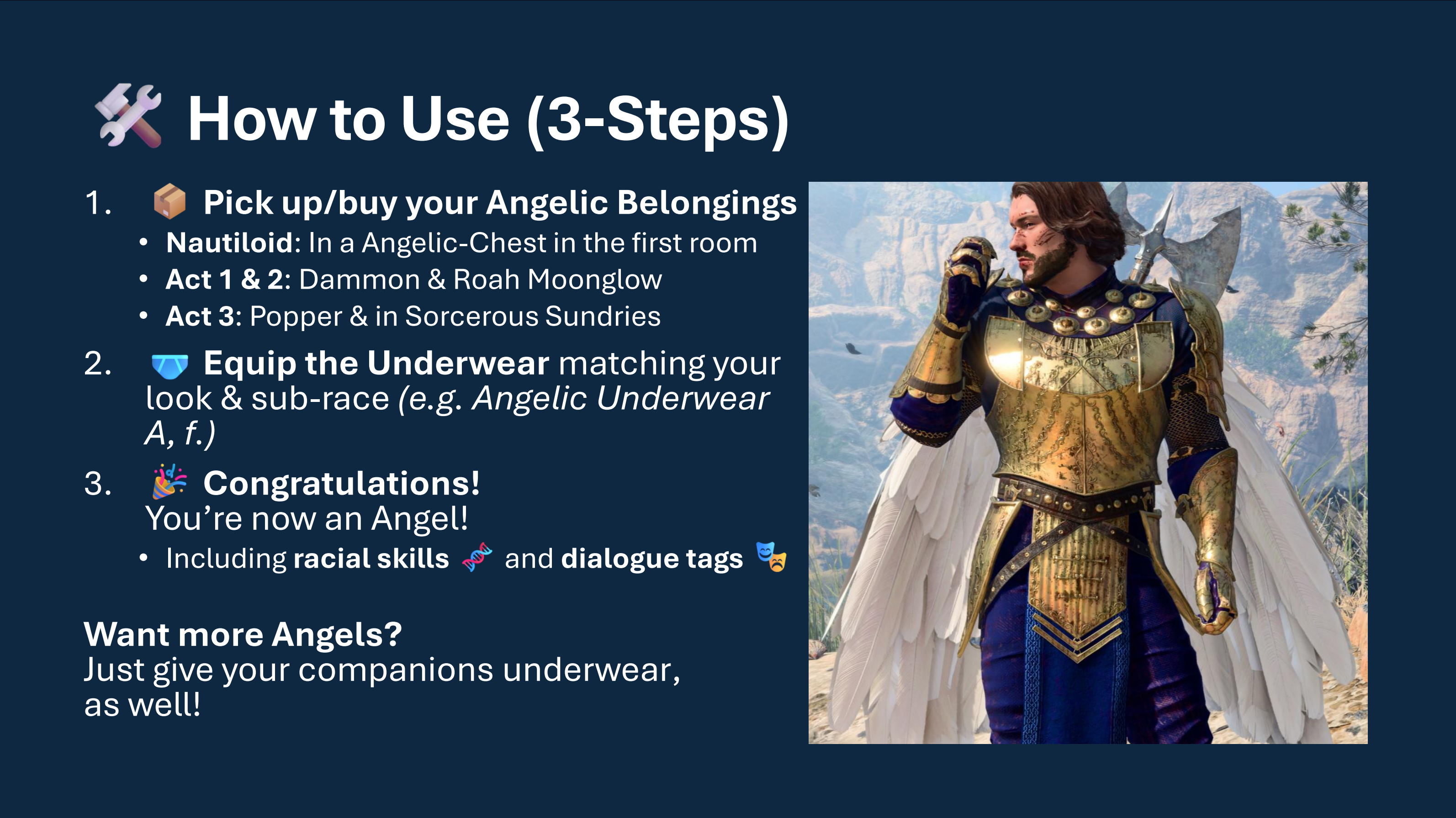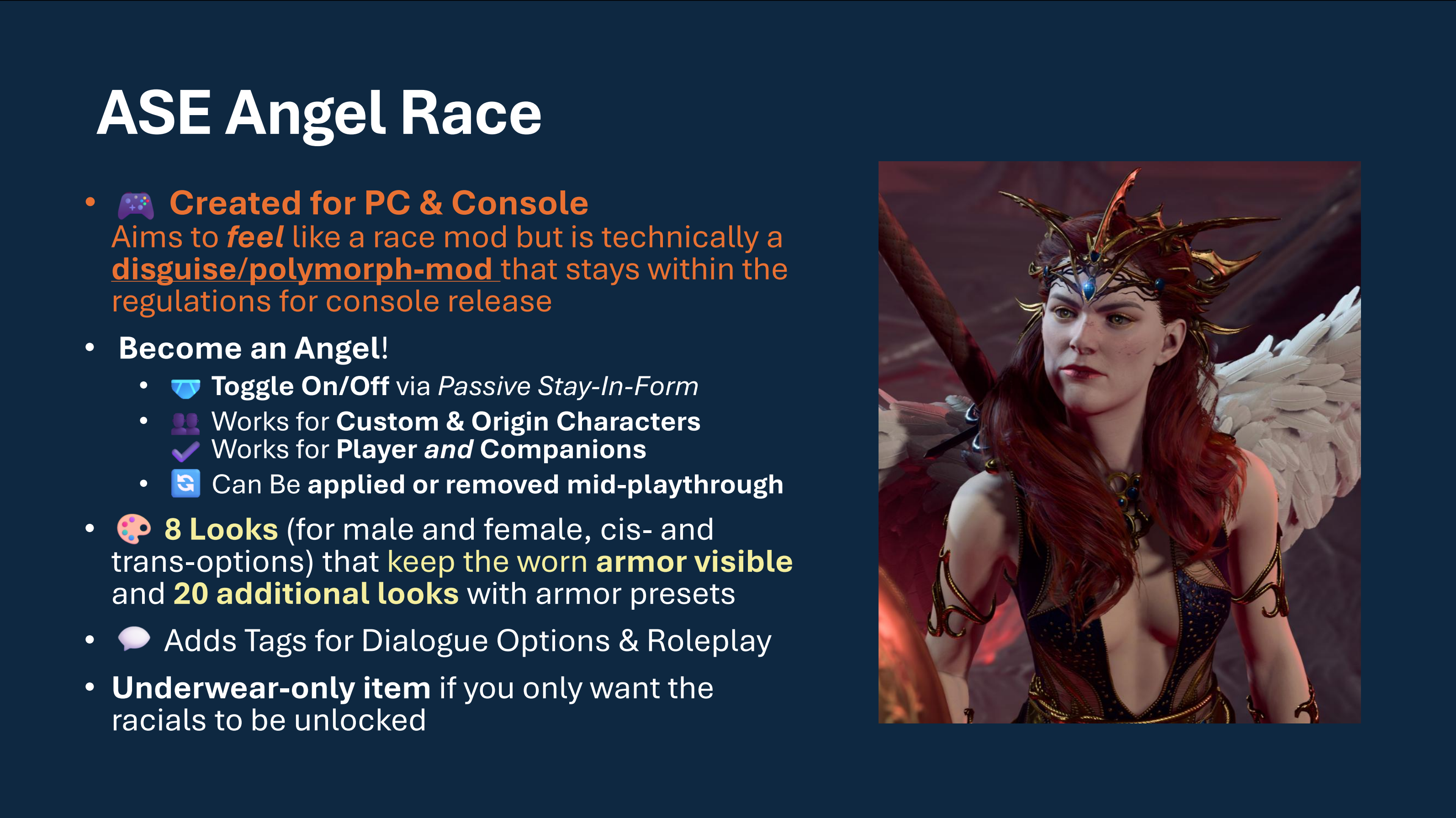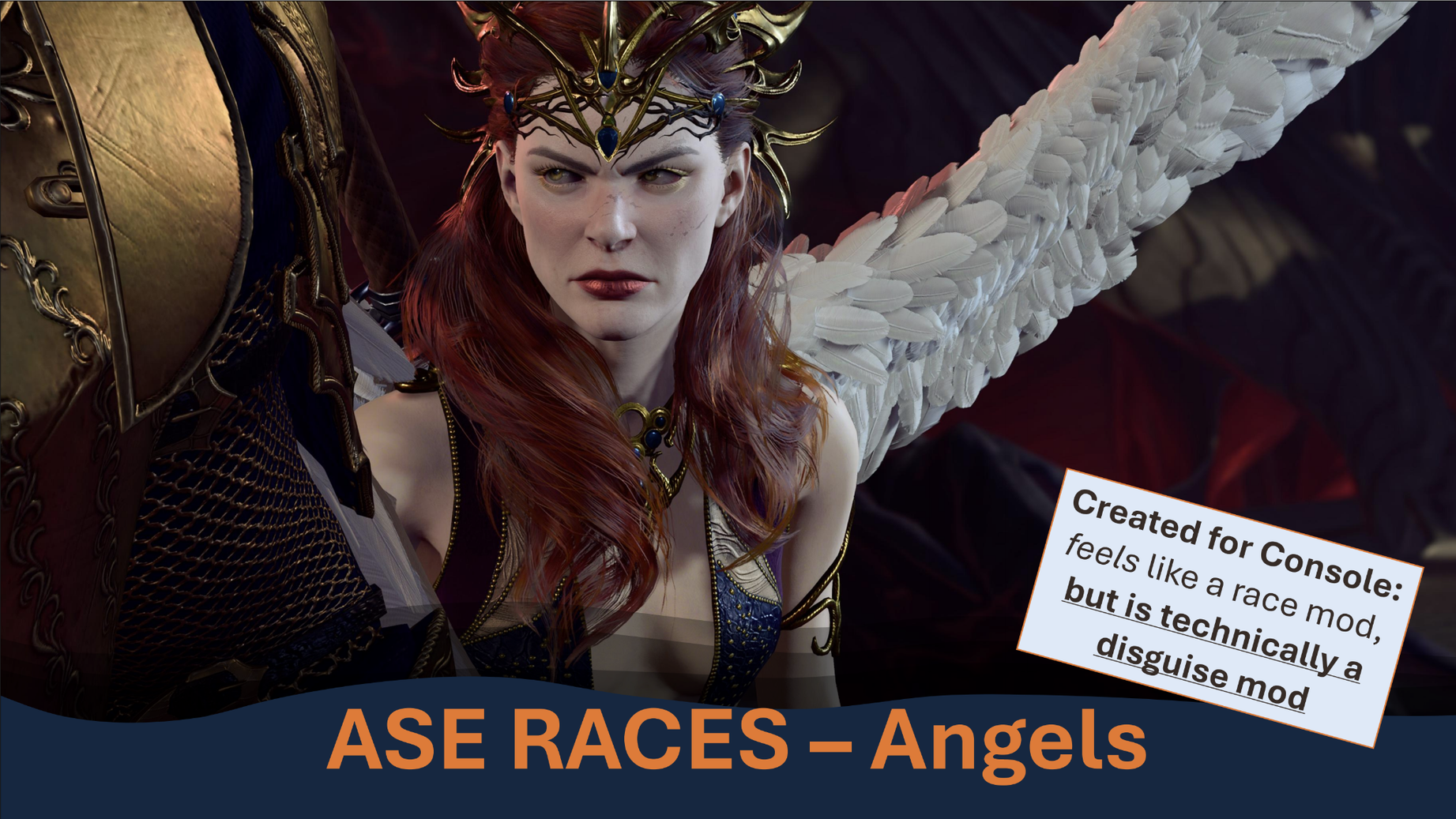 在《博德之门3》中成为一股神圣的力量吧!ASE Angels 是一个适用于 PC 和主机的 伪装模组,让你能够完全体验扮演天使的乐趣,包括翅膀、圣力、对话标签和种族被动技能——所有这些都在遵守控制台版本规则的前提下实现。