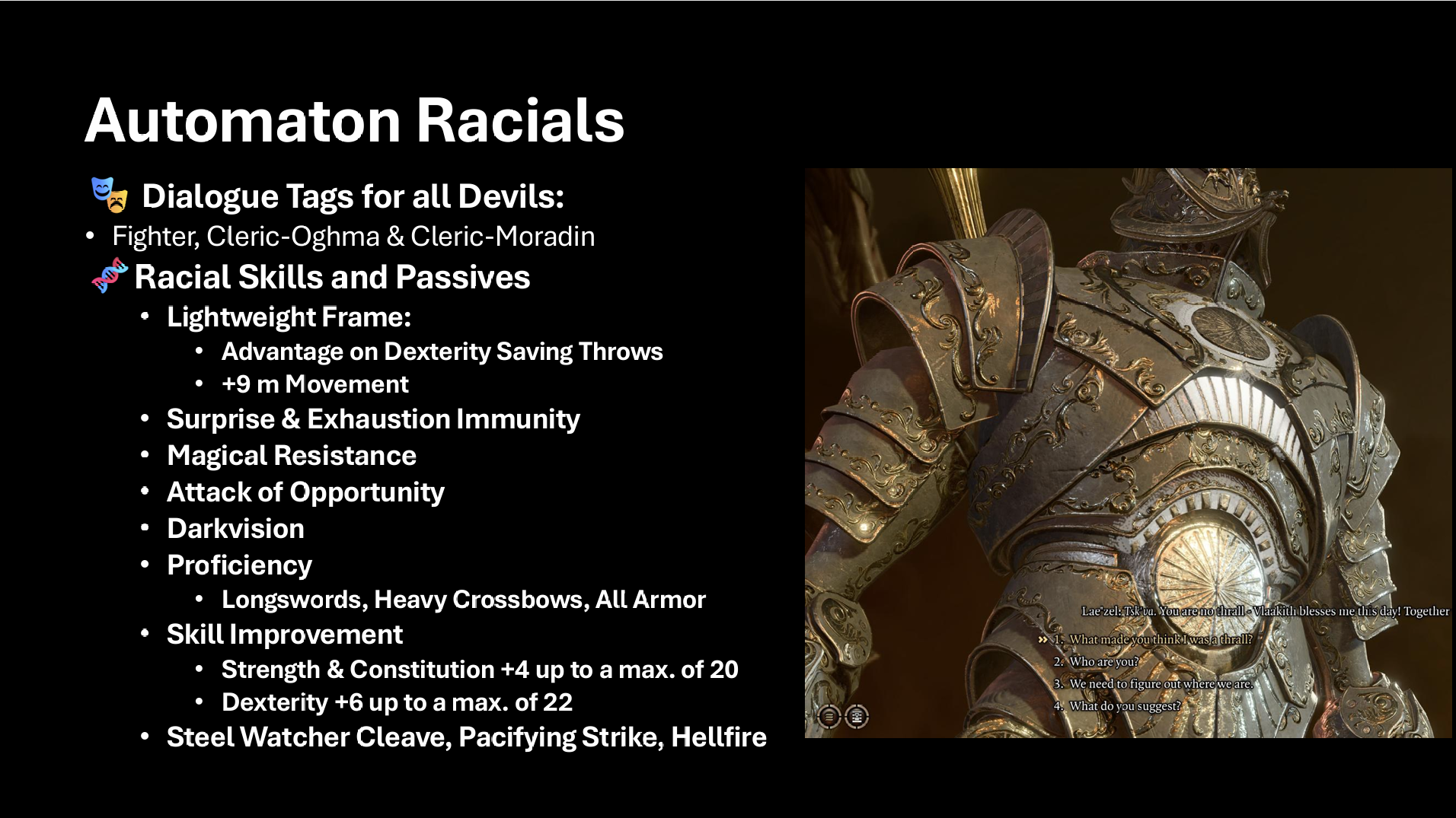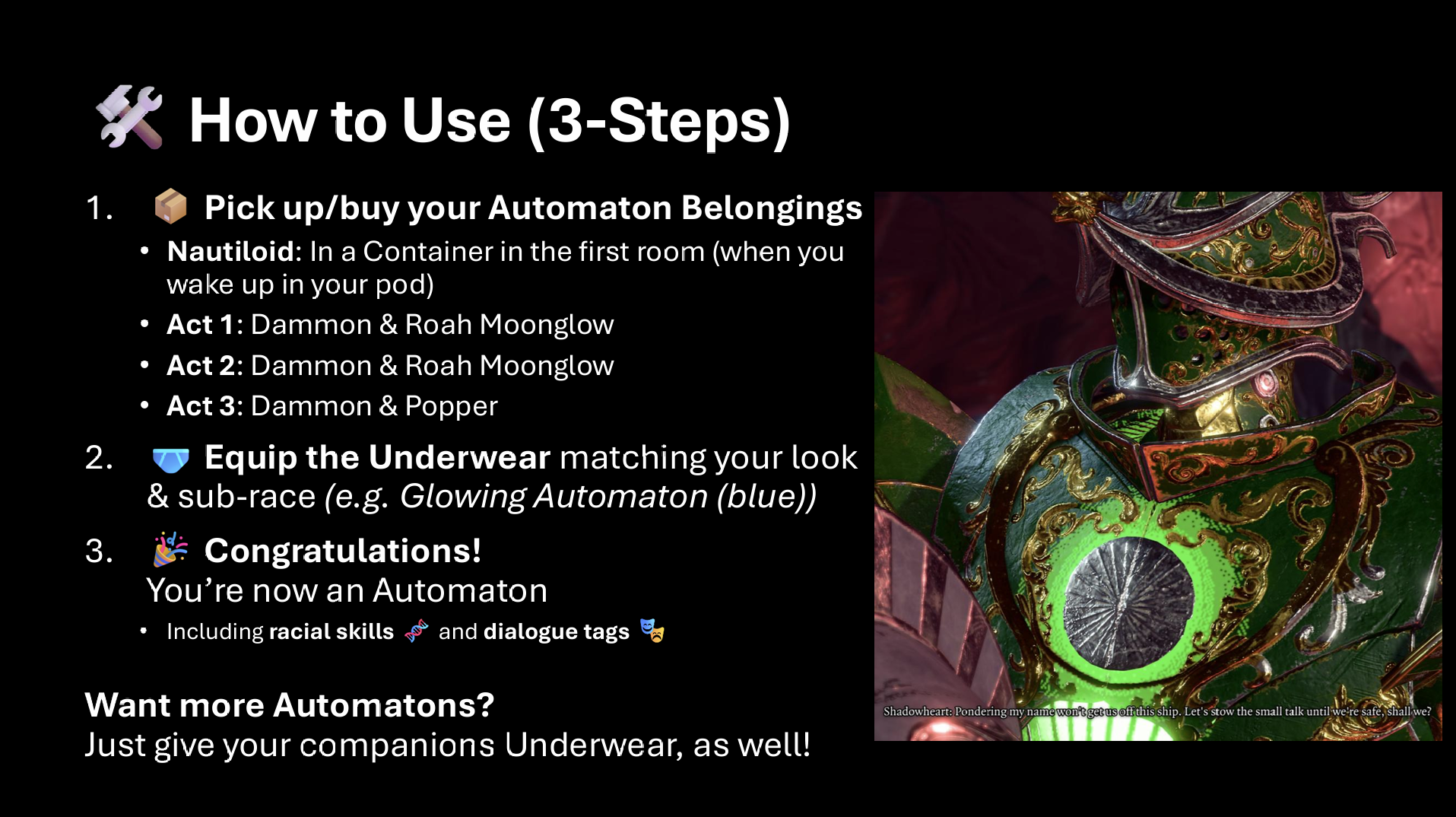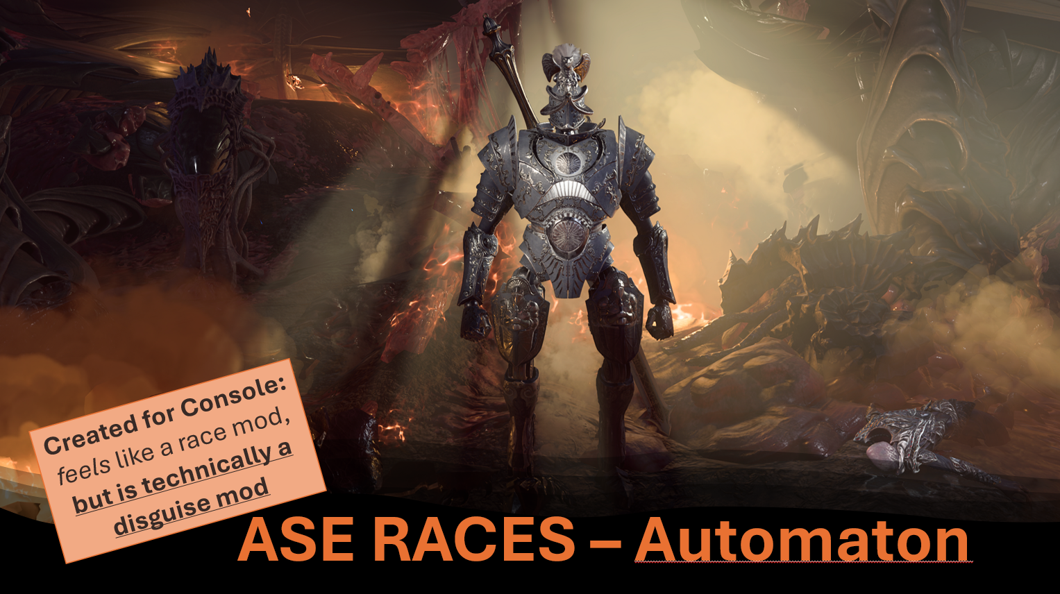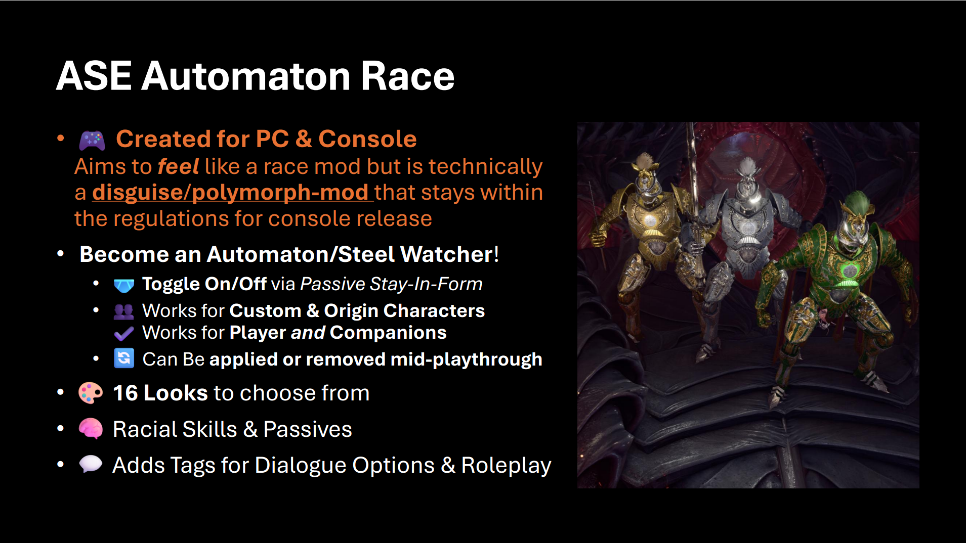 - 只有基于伪装的种族模组才能在主机上运行。每个模组必须由Larian手动测试,这可能需要数月时间。提交后无法重新提交,因此我力求构建最稳定的版本。