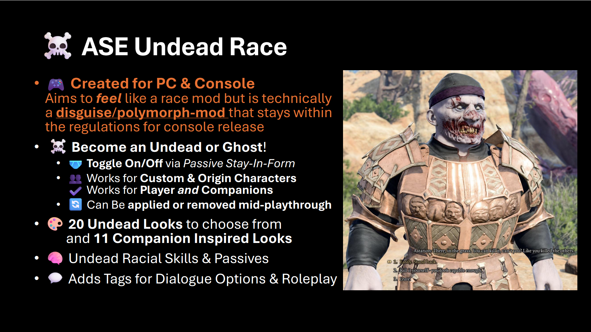 此模组提供了一种沉浸式的不死体验,感觉像是一款种族模组,但实际上通过伪装系统实现,并完全符合官方指南。