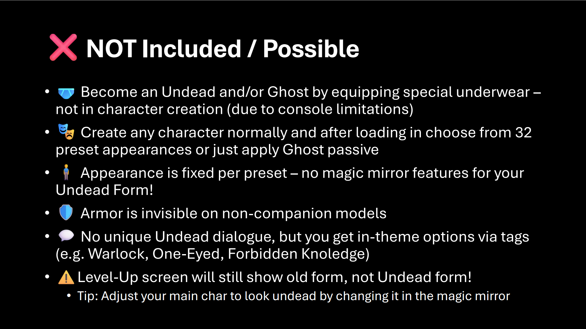 只有基于伪装的种族模组才能在控制台上运行。每个模组必须由Larian手动测试,这可能需要数月时间。提交后无法重新提交,因此我会力求最稳定的版本。