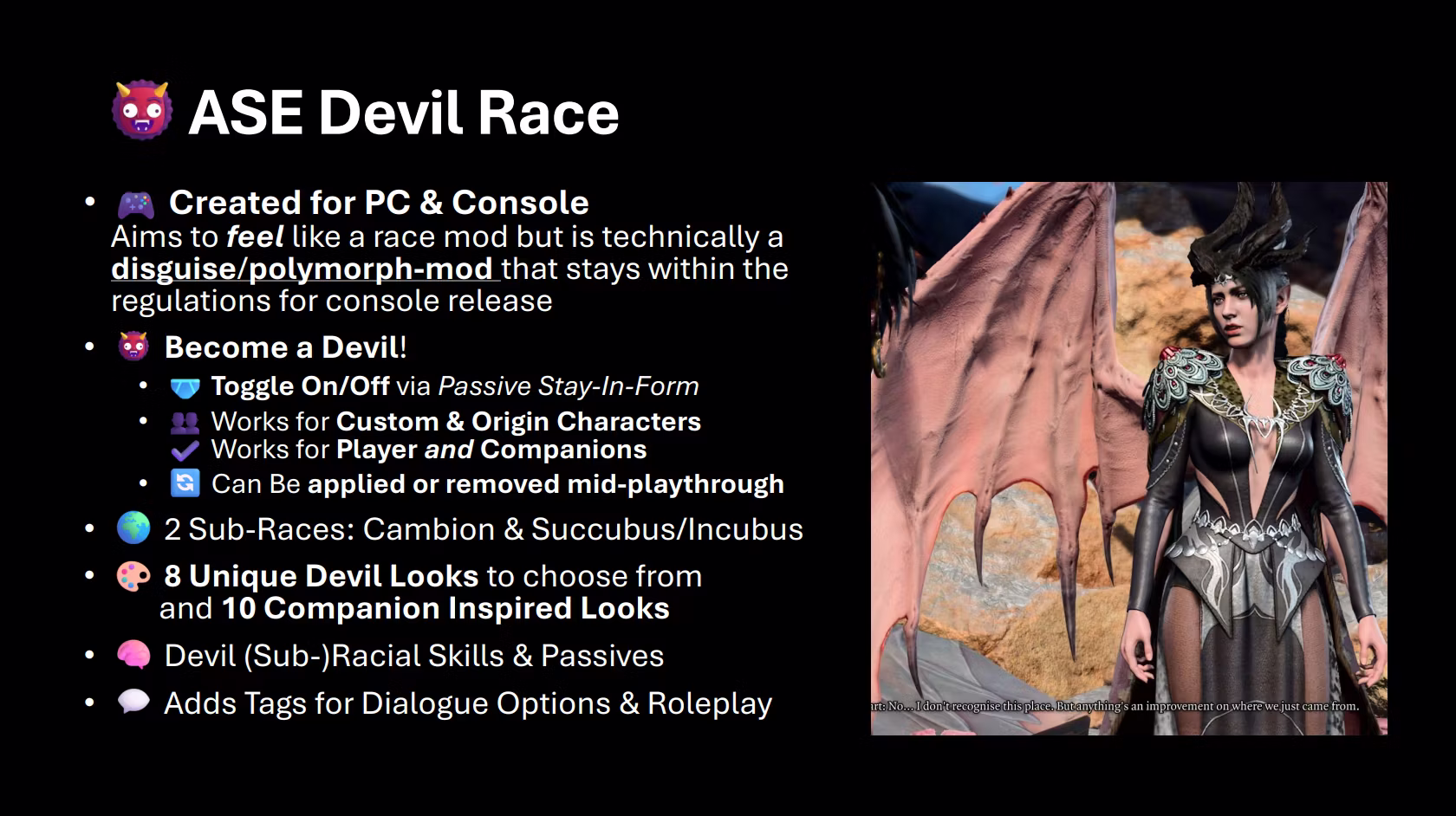 这个模组添加了两个完全可玩的恶魔亚种——半魔人(Cambion)和魅魔/美杜莎(Succubus/Incubus),使用一种友好的伪装系统。虽然技术上不是种族模组(由于控制台限制),但它感觉像一个种族模组:自定义外观、肖像、被动技能、种族法术和对话风味标签。
