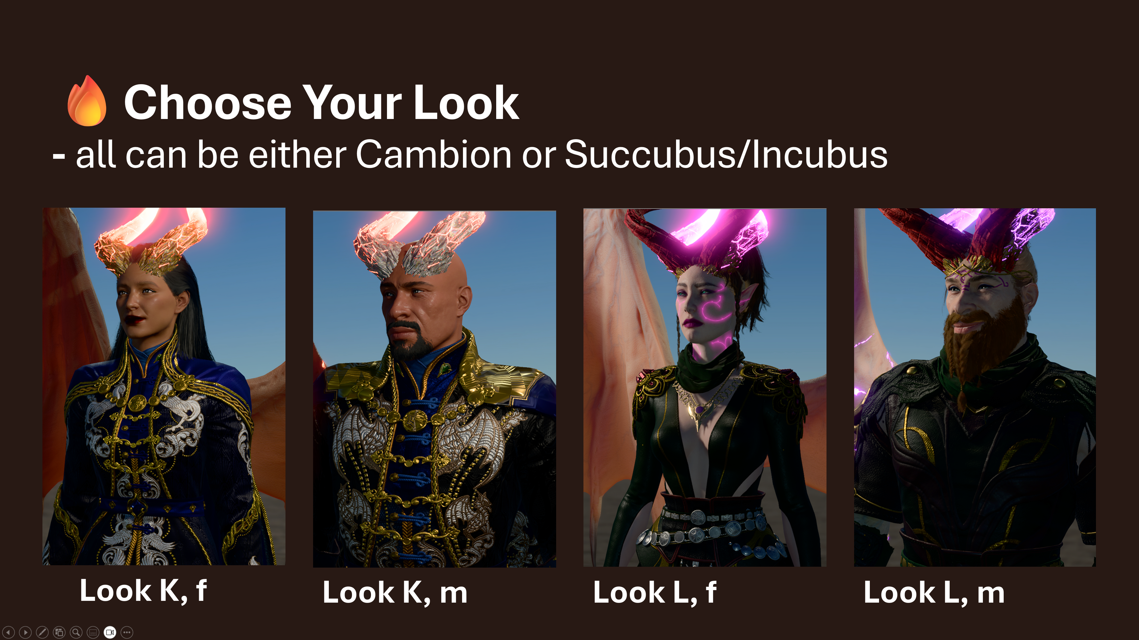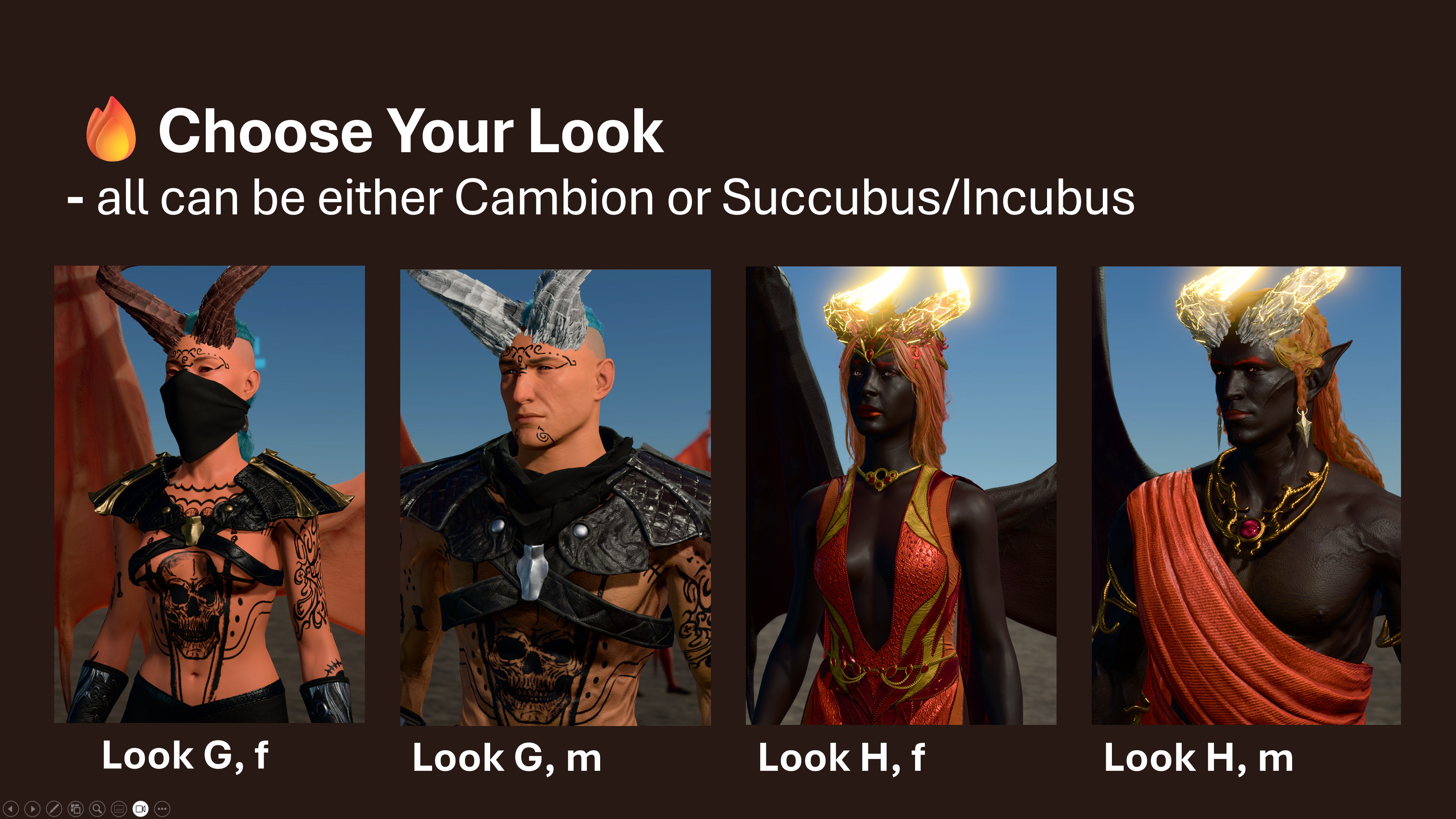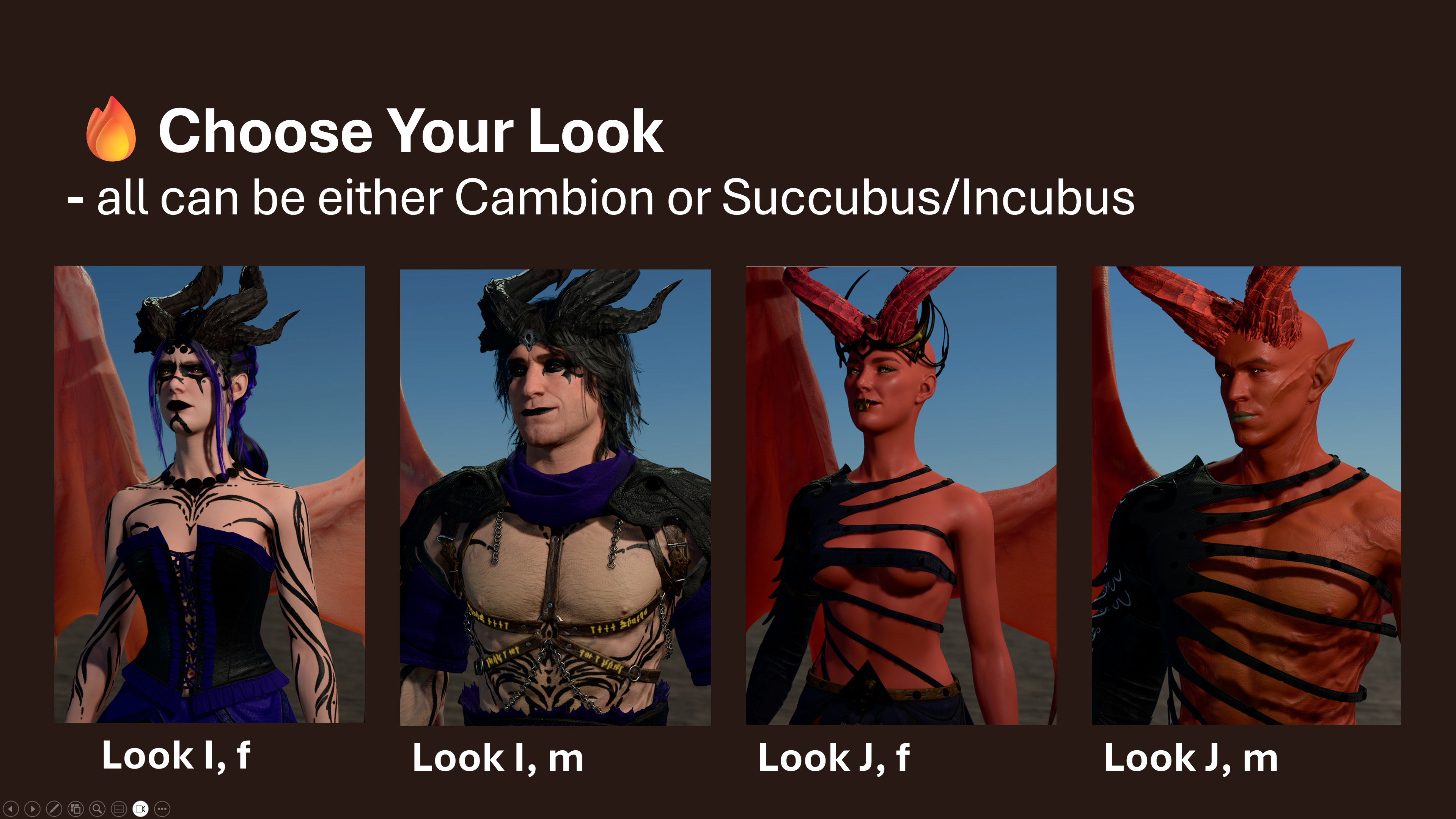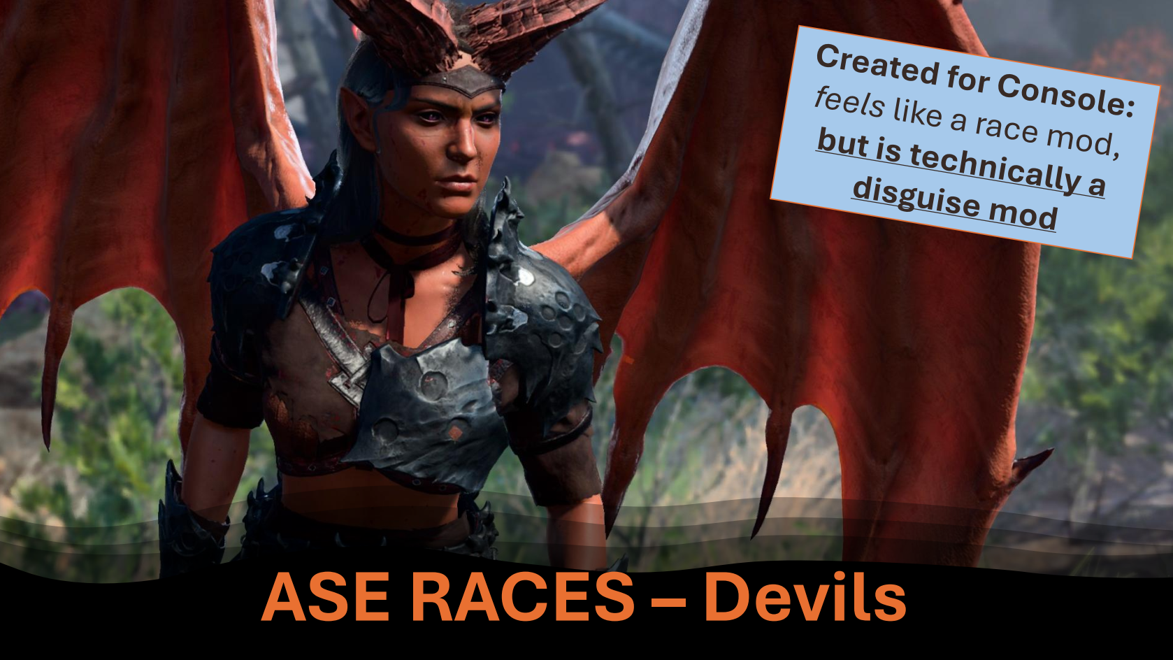 这个模组添加了两个完全可玩的恶魔亚种——半魔人(Cambion)和魅魔/美杜莎(Succubus/Incubus),使用一种友好的伪装系统。虽然技术上不是种族模组(由于控制台限制),但它感觉像一个种族模组:自定义外观、肖像、被动技能、种族法术和对话风味标签。