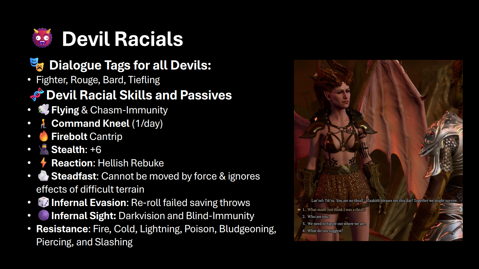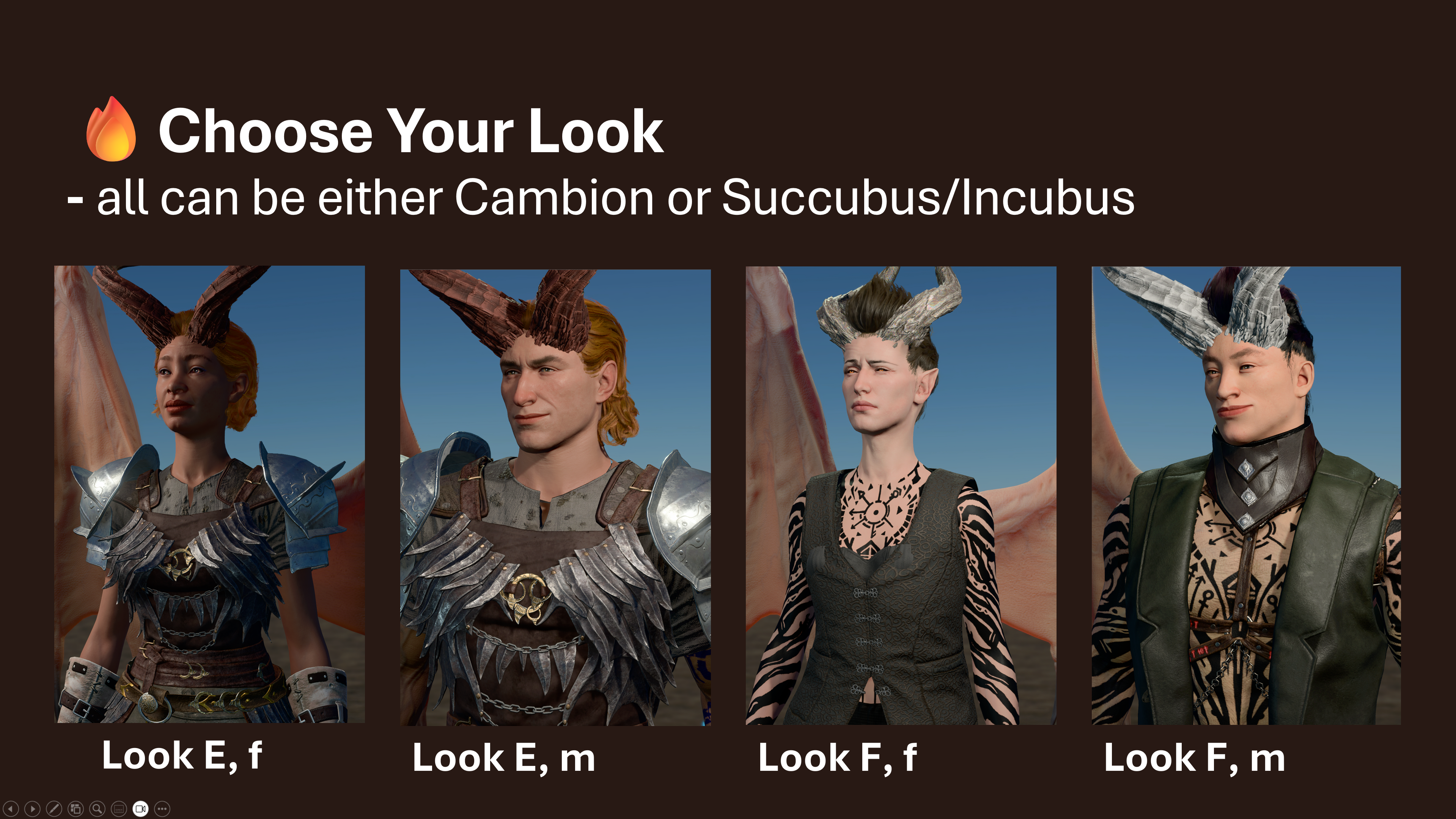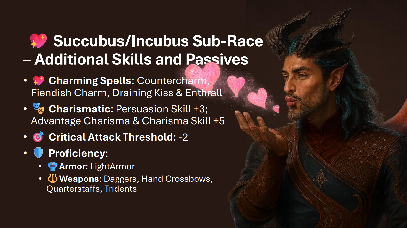 这个模组添加了两个完全可玩的恶魔亚种——半魔人(Cambion)和魅魔/美杜莎(Succubus/Incubus),使用一种友好的伪装系统。虽然技术上不是种族模组(由于控制台限制),但它感觉像一个种族模组:自定义外观、肖像、被动技能、种族法术和对话风味标签。