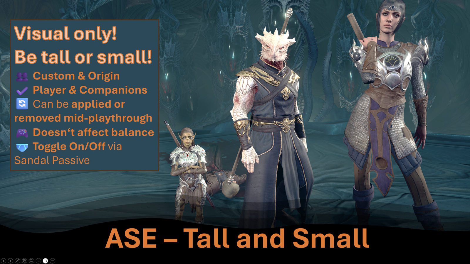 A 仅视觉效果 的模组,让你可以自由切换角色或同伴的大小而不影响游戏玩法!你可以增加或减少三分之一的高度和重量!