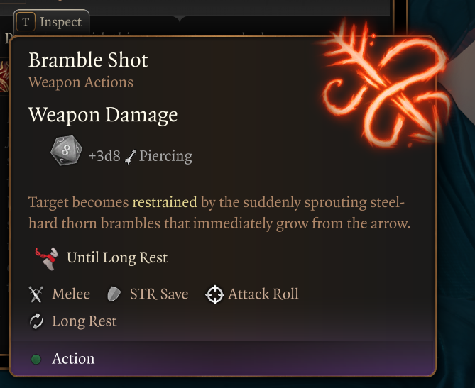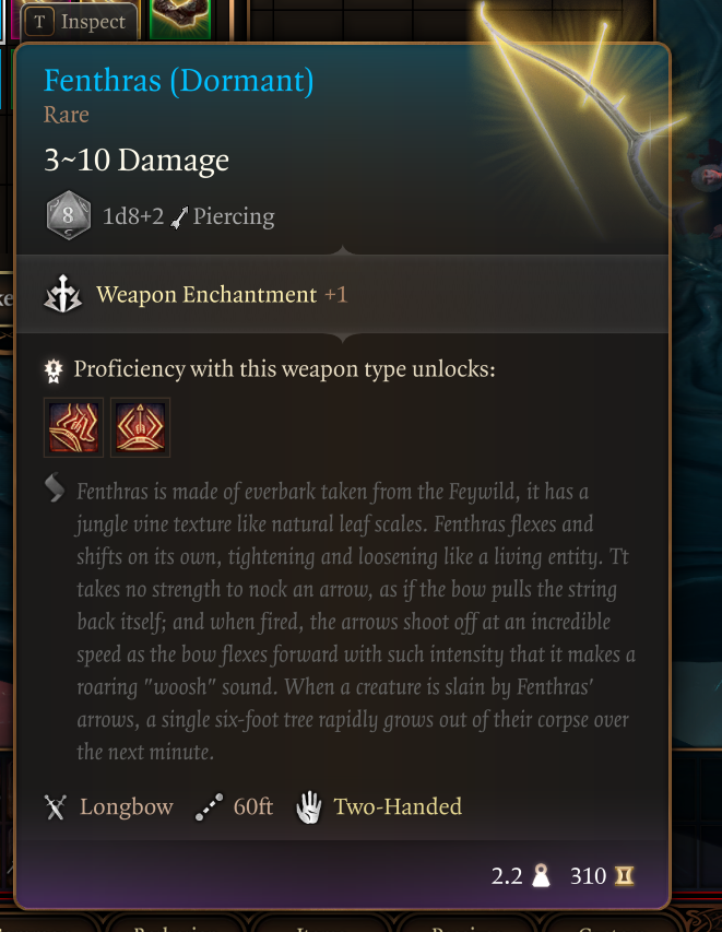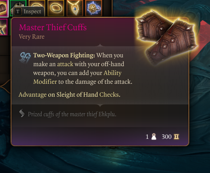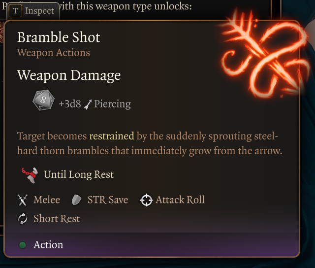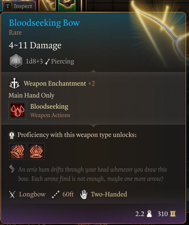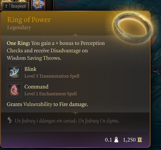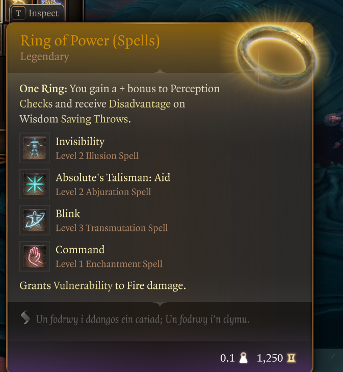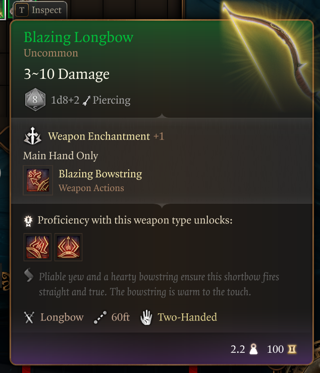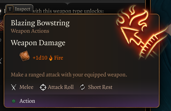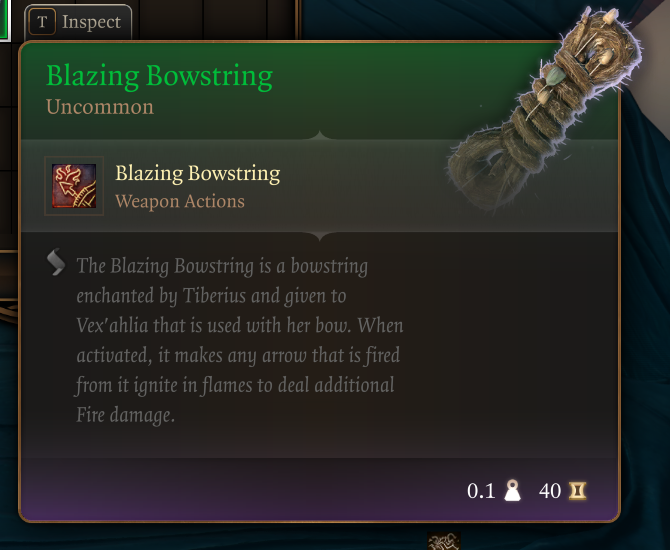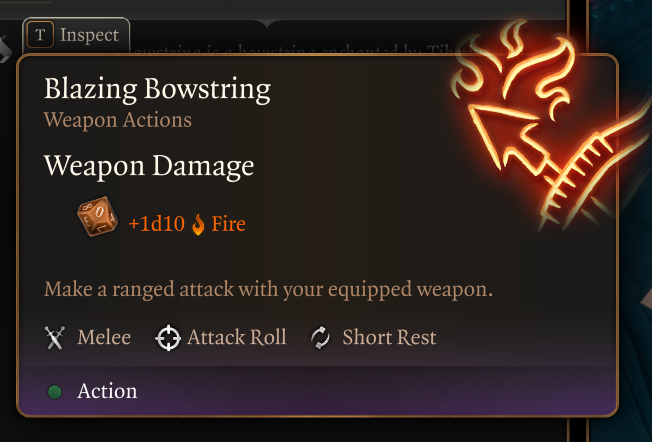 - 炽焰弓弦戒指。这是一枚你可以装备的戒指,它会给你额外1d10火焰伤害。每天使用两次或一次短休。