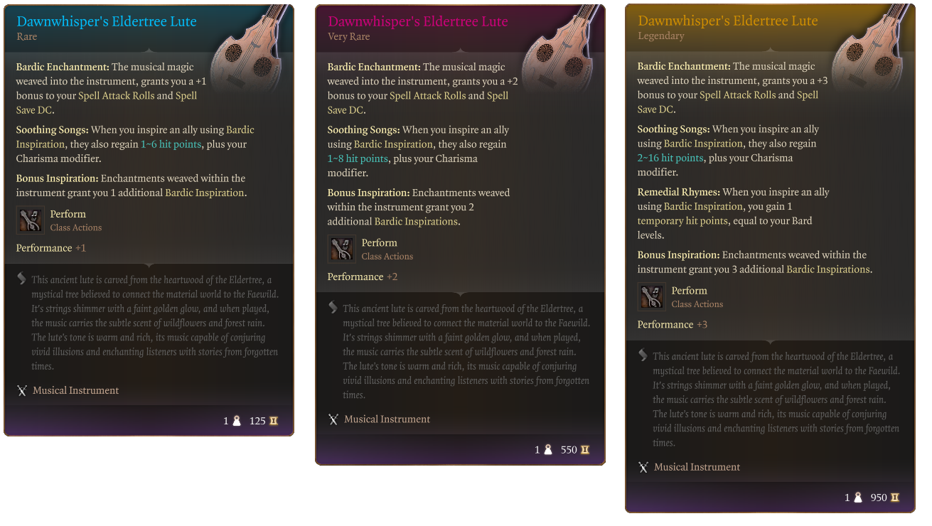 这是一组由之前的吟游诗人所有者留下的乐器,似乎是一个吟游乐团的遗物。这些乐器可以在第一幕早期被发现,并为任何拿起它们装备的吟游诗人提供一系列好处。在战役后期找到的一些特殊音乐盒将提供机会来升级所选乐器,增加其好处和收益,理想情况下使该乐器与吟游诗人在整个战役中同步成长。