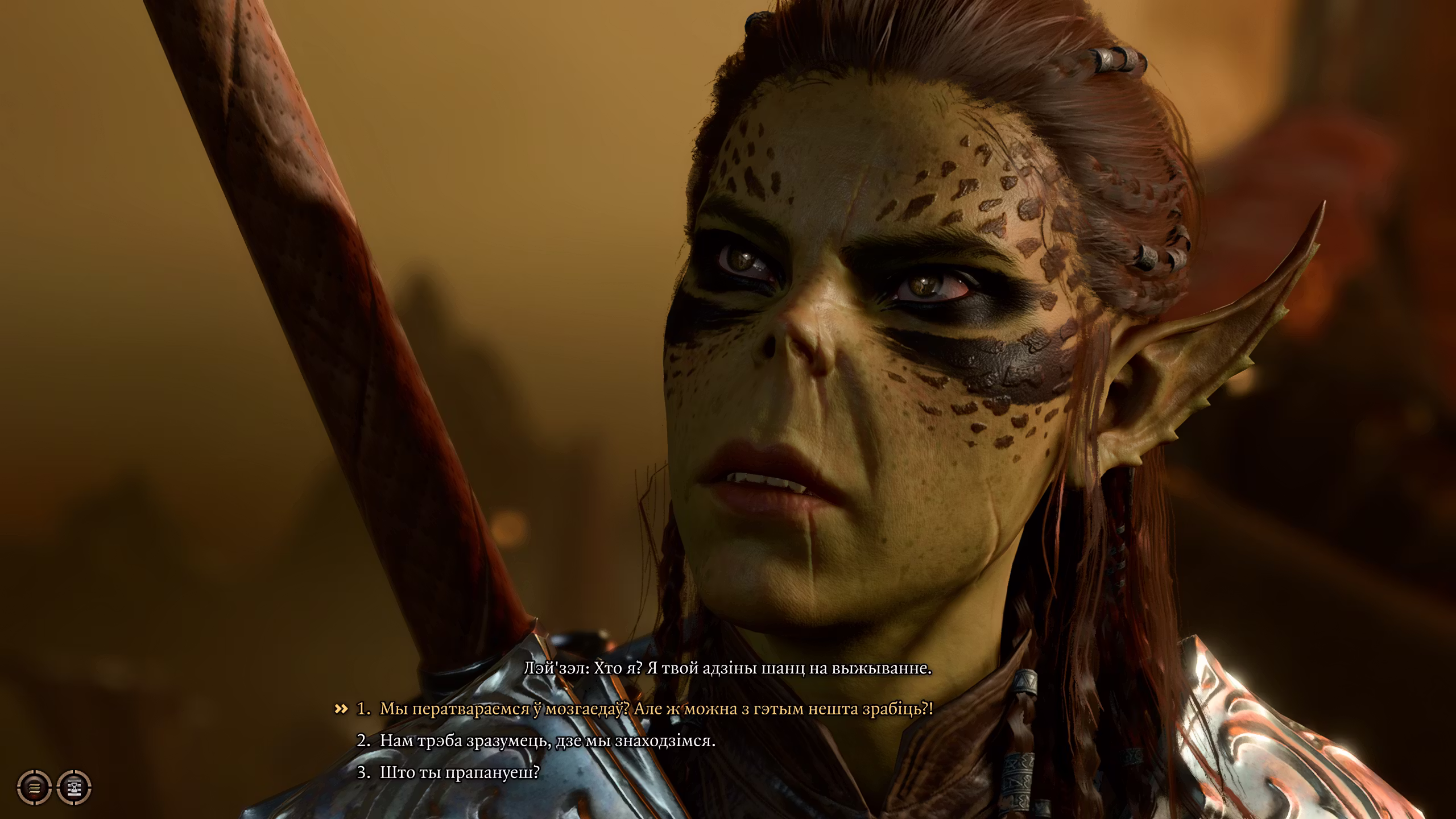 - 存档中的同伴名字可能不会被翻译,因为它们存储在存档文件中。但对于新的冒险来说,所有内容都应该是白俄罗斯语的。