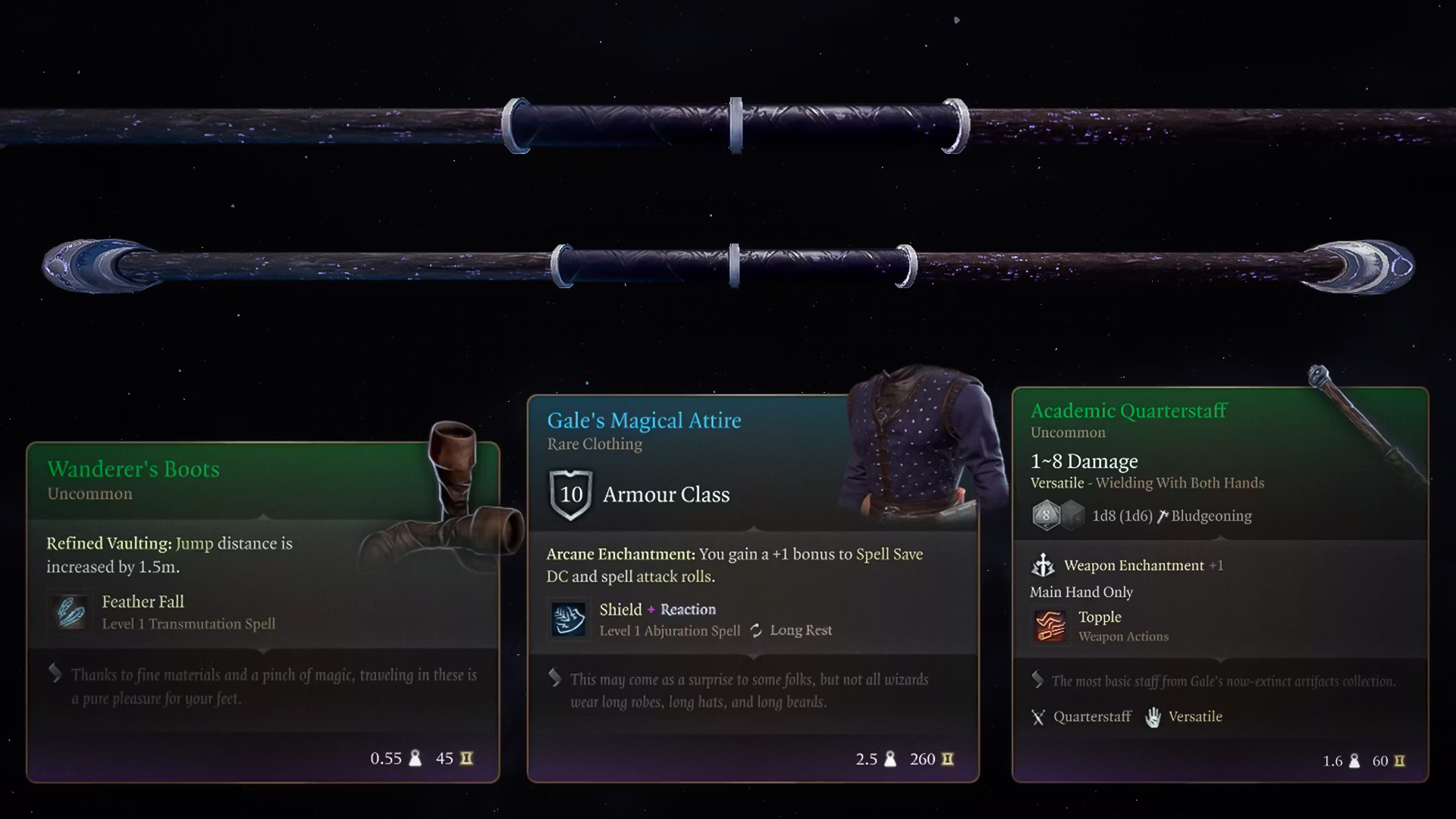 收到的内容:为 Gale 新增初始装备 — 魔法服装、流浪者靴子、Wu 的灵活四角杖