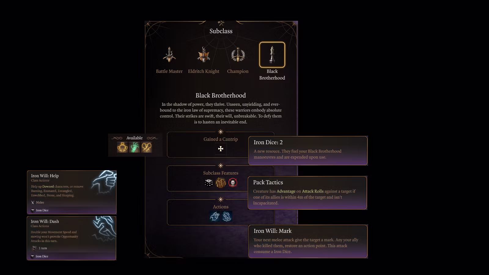可开关式被动:你的下次攻击将标记目标,如果你或你的队友自己将其杀死,你或你的队友恢复一个动作。使用钢铁骰子。