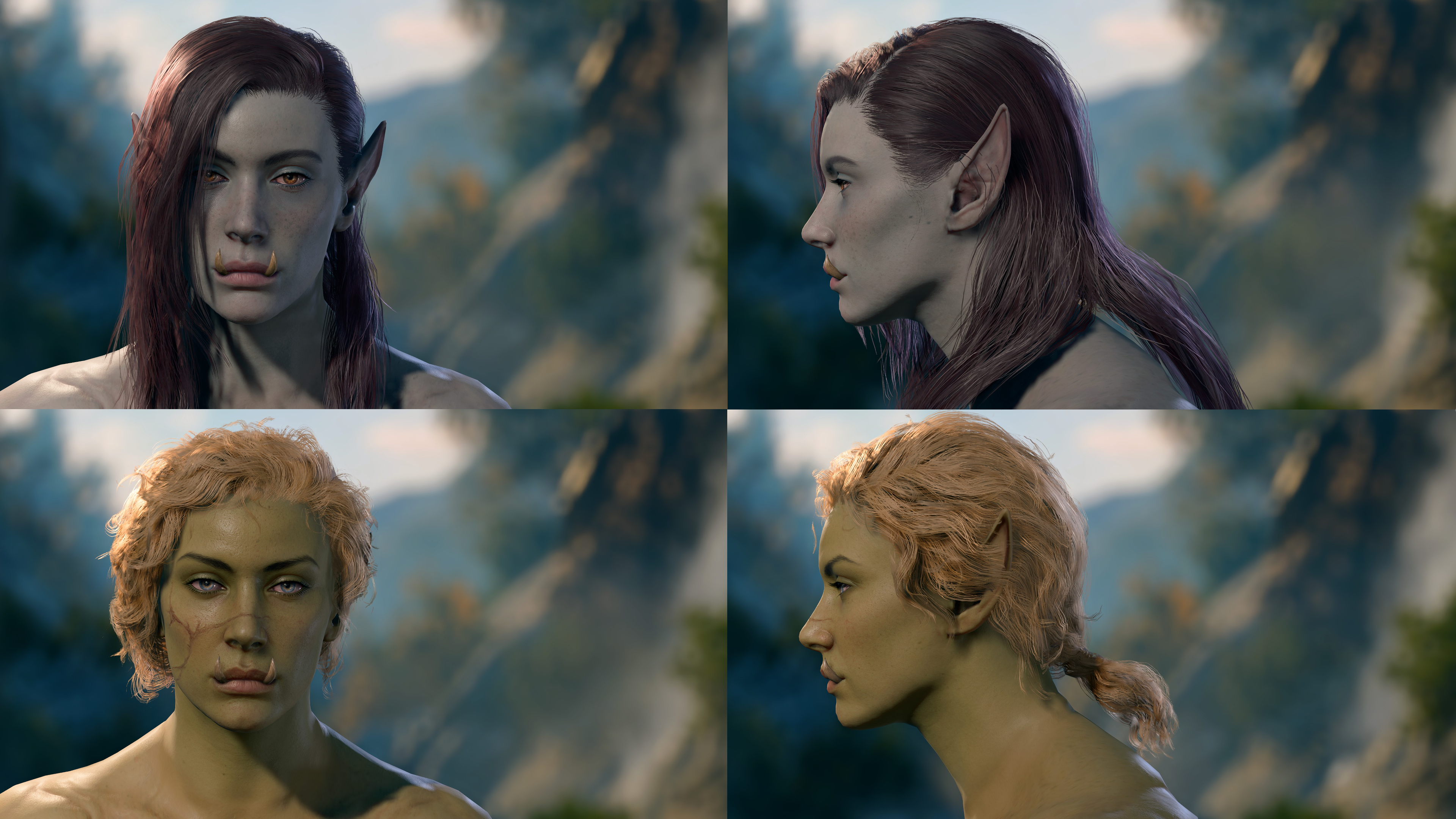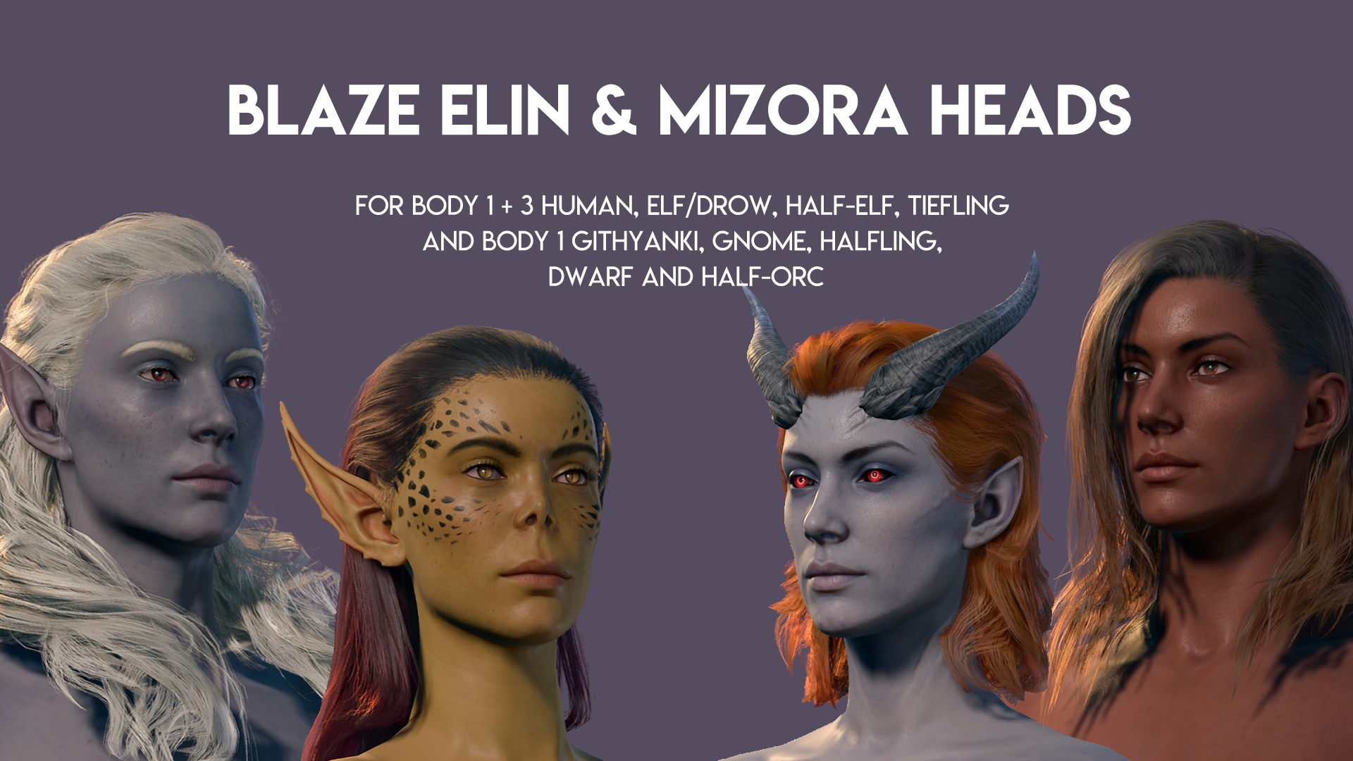 Mizora 和 Blaze Elin 的头部适用于以下身体类型:1 + 3 人类、半精灵、杜尔衮/精灵、提夫林,以及身体 1 吉斯扬基、侏儒、半兽人、霍比特人、矮人。