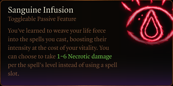 血色灌注是一个可以切换的被动特性,类似于术士的元法能力。在每个回合开始时,在施放法术之前,你可以选择点击技能栏上的该特性来使用你的生命值而不是法术位来强化法术。