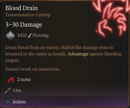 - 吸血 – 随从法术 – 造成1d10(5级时为2d10,10级时为3d10)伤害,并恢复施法者一半的伤害值。持续出血效果2回合。对出血目标有优势。构造体不受影响。