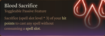 - 血之共融 – 开关被动技能 – 舍弃(3 * 使用的法术等级)生命值以使你的法术每次造成伤害时恢复你(1d6 + 3)的生命值。