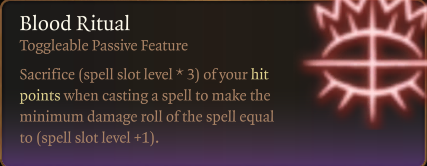 - 血祭仪式 – 开关被动技能 – 舍弃(3 * 使用的法术等级)生命值以使施放的法术最小伤害等于(使用的法术等级 + 1)。例如:如果你使用标准,三级火球法术,造成8d6伤害(8-48范围),则在血祭仪式下,最小伤害变为4,即伤害范围变更为32-48。