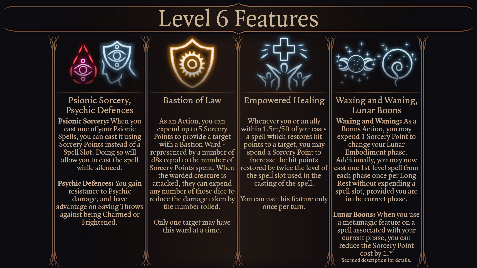 我的“副职之书”系列的第三部作品已经到来:法师!和我大多数模组一样,由于游戏的一些功能限制,我不得不对源材料进行一些修改。众所周知,当涉及到 6 级以上的副职特性时,法师的等级进度有点粗糙(这也是为什么 Larian 将《博德之门3》中的第14级特性下调到第11级的原因)。为了使这个模组…