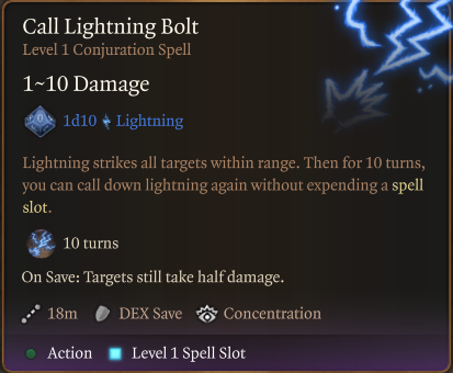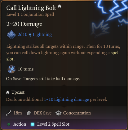该法术的伤害骰为1d10,在施放时会根据法术等级进行扩展,每级增加1d10。因此它的威力与“召唤闪电”相同,但是你可以更早获得它。