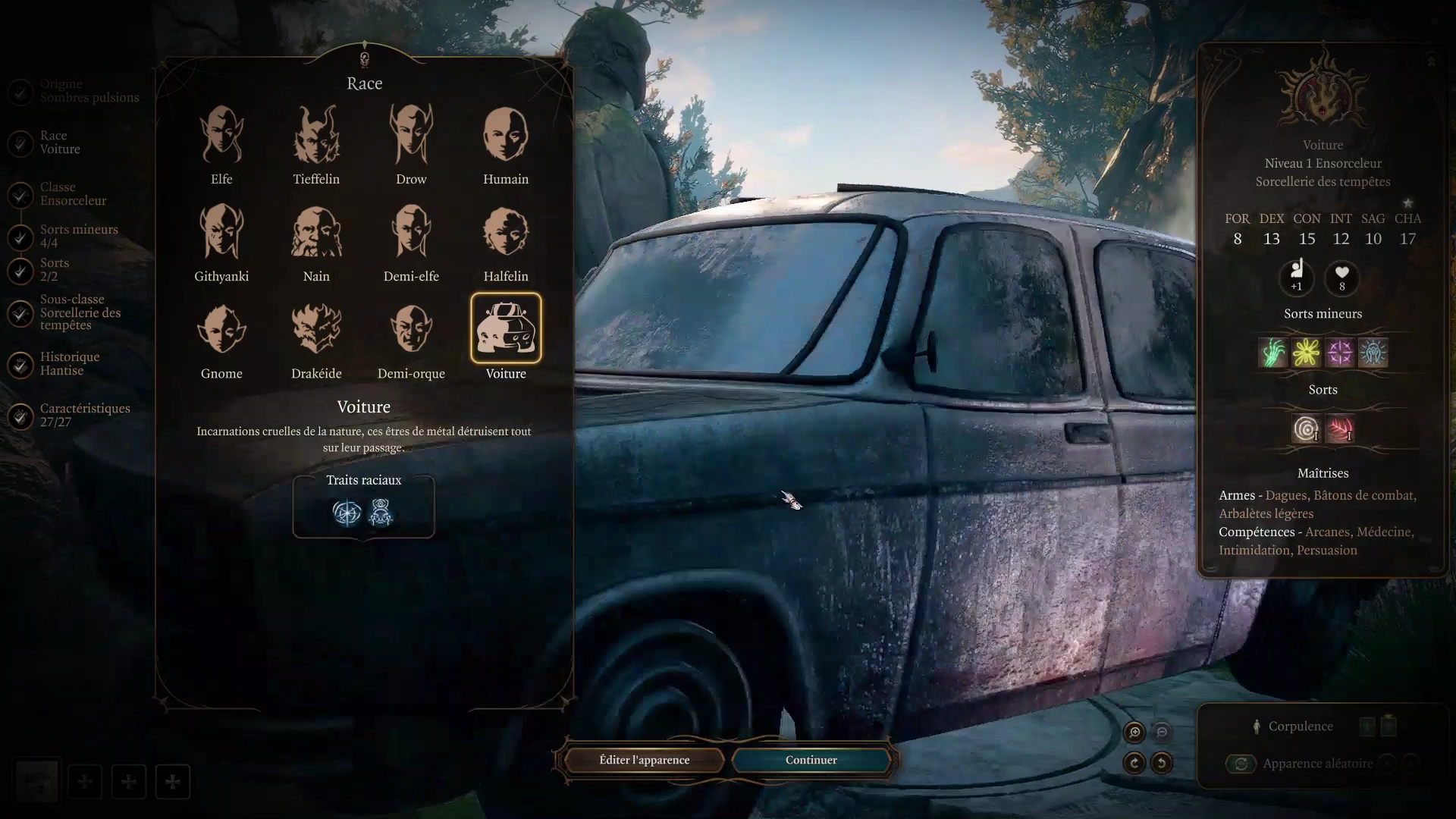 赋予任何玩家角色变成汽车的能力。你也可以选择成为可玩种族中的汽车,这虽然很有趣但会破坏电影级过场动画。汽车可以获得一些独特的法术。