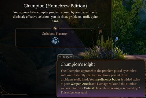 请注意,该模组并没有真正改变原始流派本身,而是添加了一个名为“冠军(自制版)”的类似类,以避免与其他修改原始流派或增加12级后属性的扩展模组产生冲突。由于没有与战士子类相关的对话标签,因此(希望如此)不会与任何对话选项发生冲突。